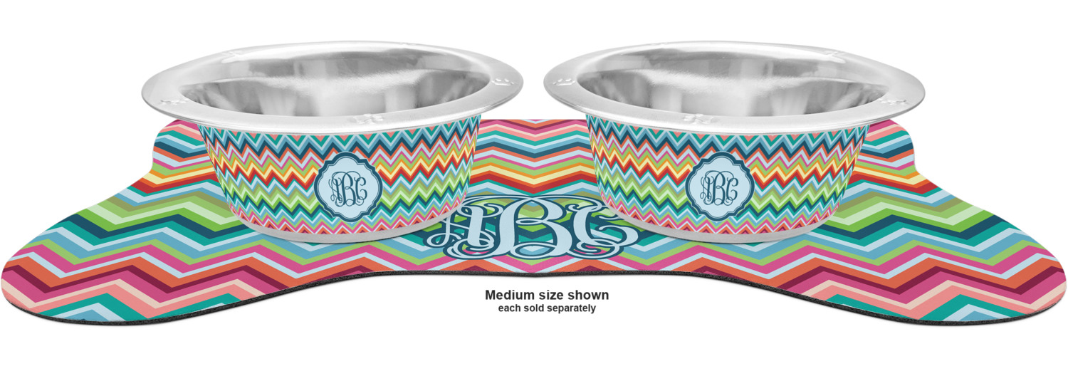 The top of this mat displays your custom design, as it is printed on polyester. To prevent slippage, the underside of the mat is made of rubber. We offer a small dog food mat, suitable for smaller dogs and a large dog food mat for bigger breeds. The small dog food mat is approximately 19 by 13 inches, while the large dog feeding mat measures at approximately 26.75 by 18 inches. Both personalized mats are ideally sized to fit two dog bowls.