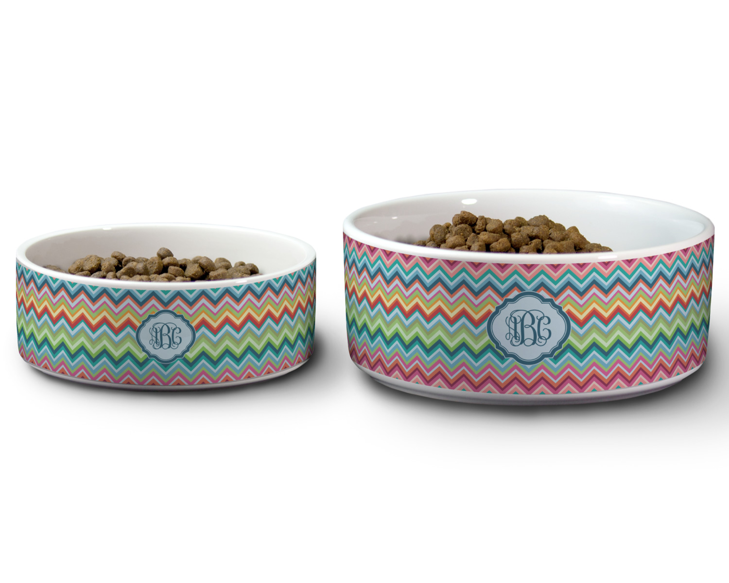 We carry these custom dog bowls in two available sizes: medium and large.The medium is 6 inches in diameter and 2.5 inches tall, and can therefore suit pets who eat up to 2.5 cups of food per meal. The large pet bowl is 7 inches in diameter and 3 inches tall, and suits pets who require up to 4.5 cups of food per meal.