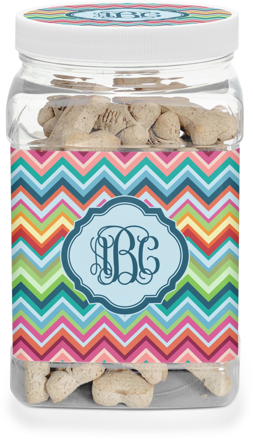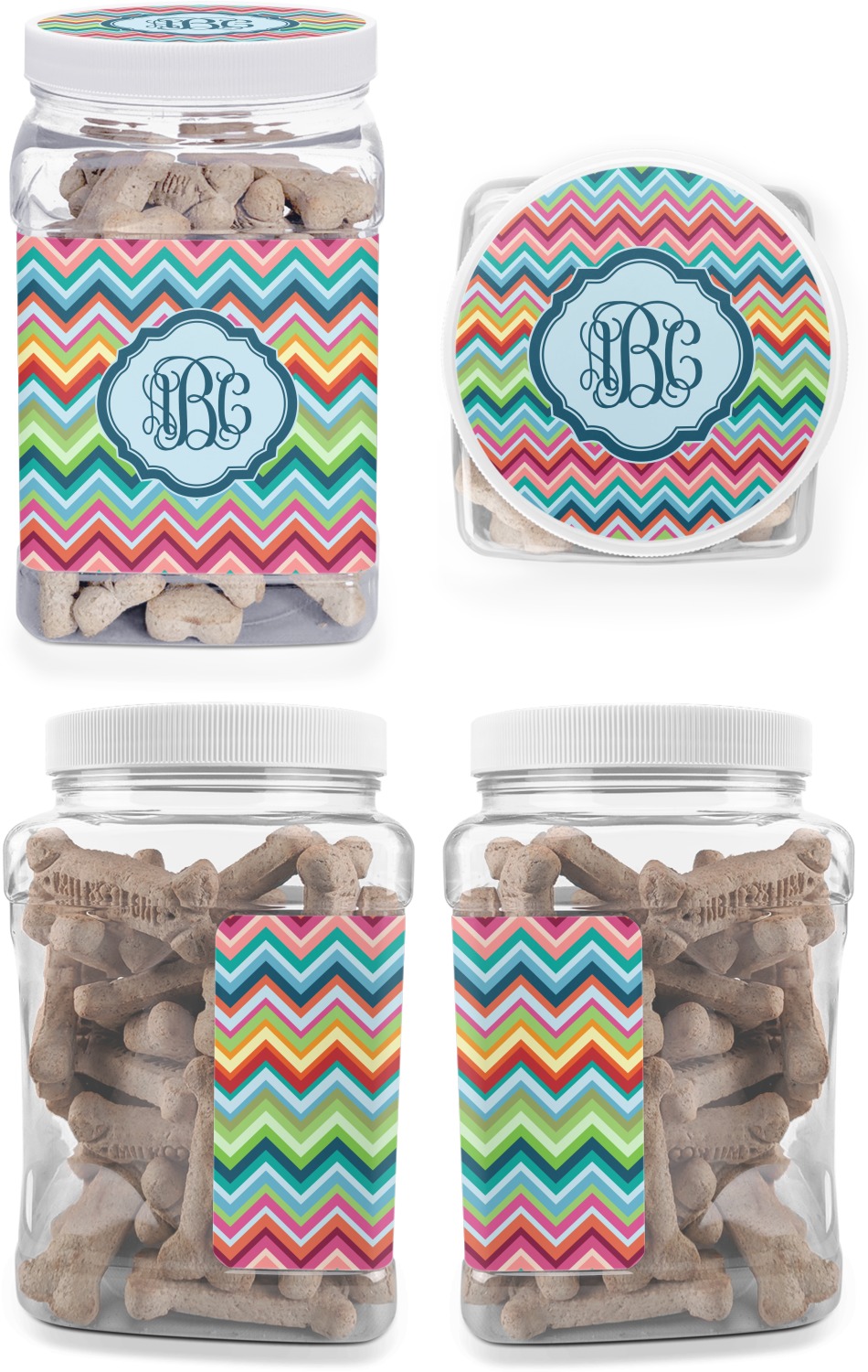 This half gallon jar, made from a sturdy plastic, is the perfect way to keep treats from any naughty pet paws, while still keeping them ready on hand for when your pup performs an impressive trick. This dog cookie jar features a screw-on, white lid that displays your personalized design on a vinyl sticker. We apply another customized sticker that wraps around the front and sides of the jar. Our dog treat jar also has indentations on the rear ends of the sides, which allows for convenient handling, and its square frame allows for easy storage.