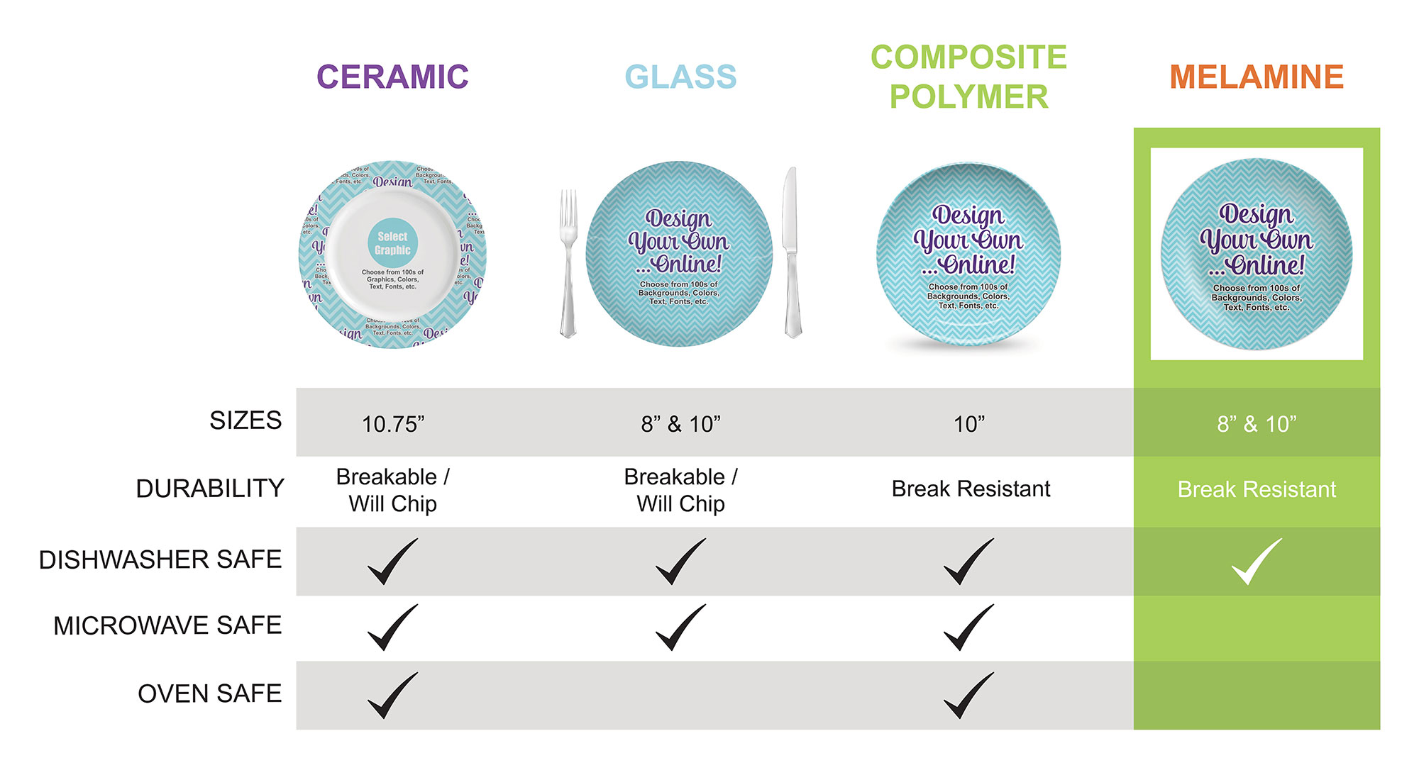 If you're looking for a way to accent your dinner table with personalized, yet functional, accessories that will survive daily use, our melamine plates are the perfect option for you. Design these custom plates to match the personalities and tastes of your family members and loved ones!