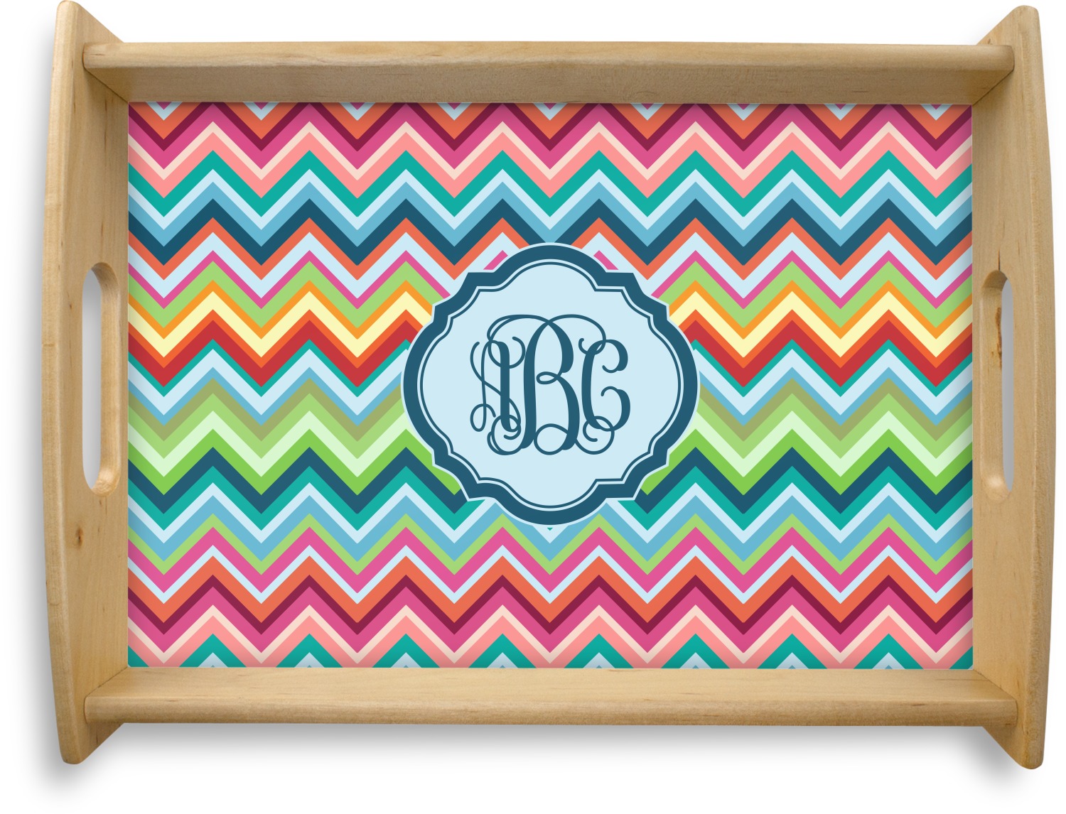 This serving tray with handles features square edges and two rounded sides, creating a very modern look. Each side is fabricated from a beautifully cut, natural wood. The bottom of the interior of the tray displays your customized design in bright, vibrant color. The tray is sold in both a black color and a natural wood look. Each variation of the wood serving tray has two sizes: Small, which is 14" x 10" x 2.25", and Large, which is 19.5" x 13.5" x 2.75".