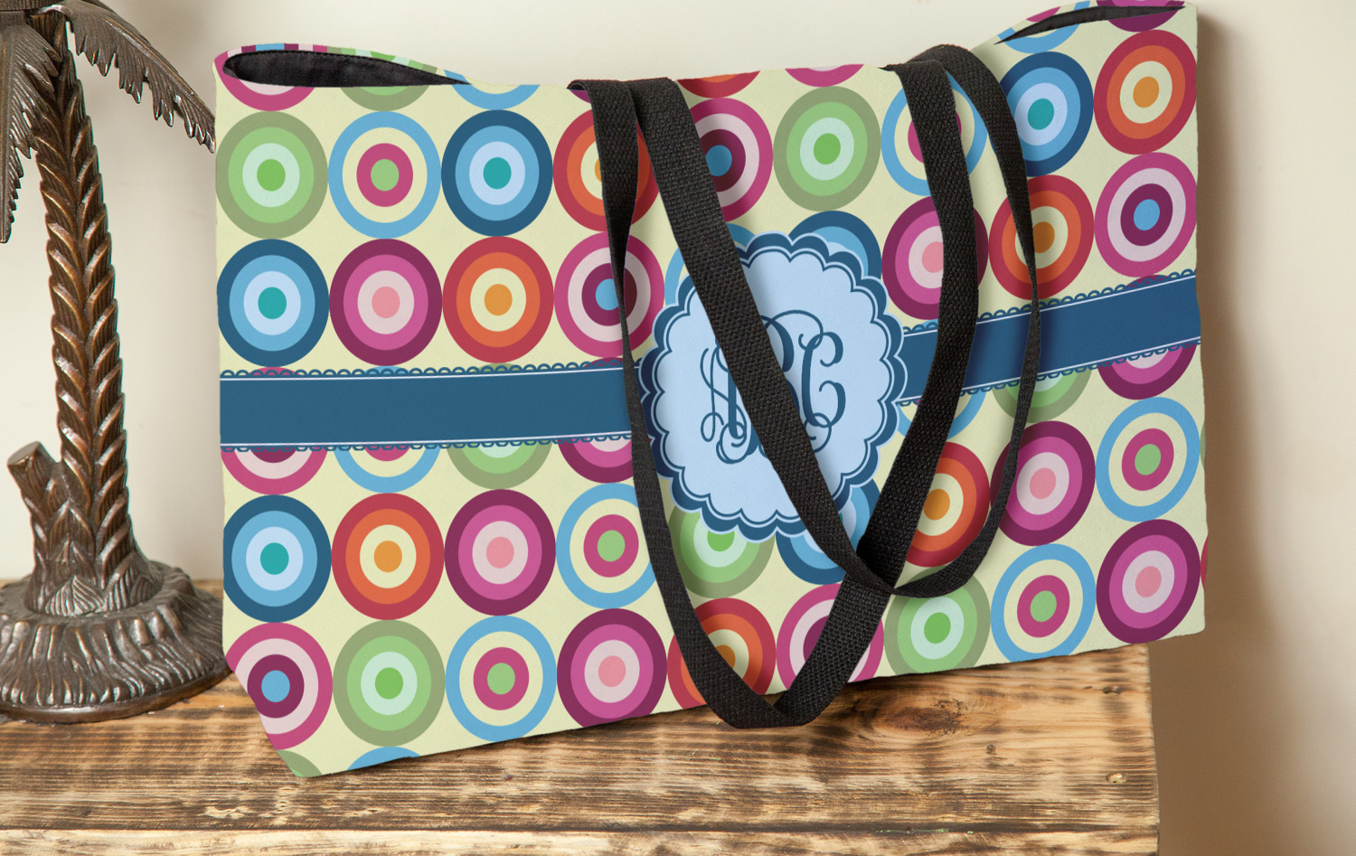 The totes are made from a sturdy canvas material on the outside and are lined with a black poly cotton lining. The beach totes have an approx. 28" black woven handles.