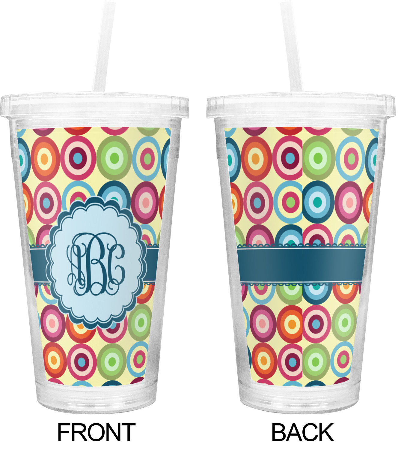 These BPA free tumblers with their double walls keep your drink cold and will not sweat on the outside; they have a clear acrylic top and a reusable straw with a ring around the bottom to keep the straw from falling out.