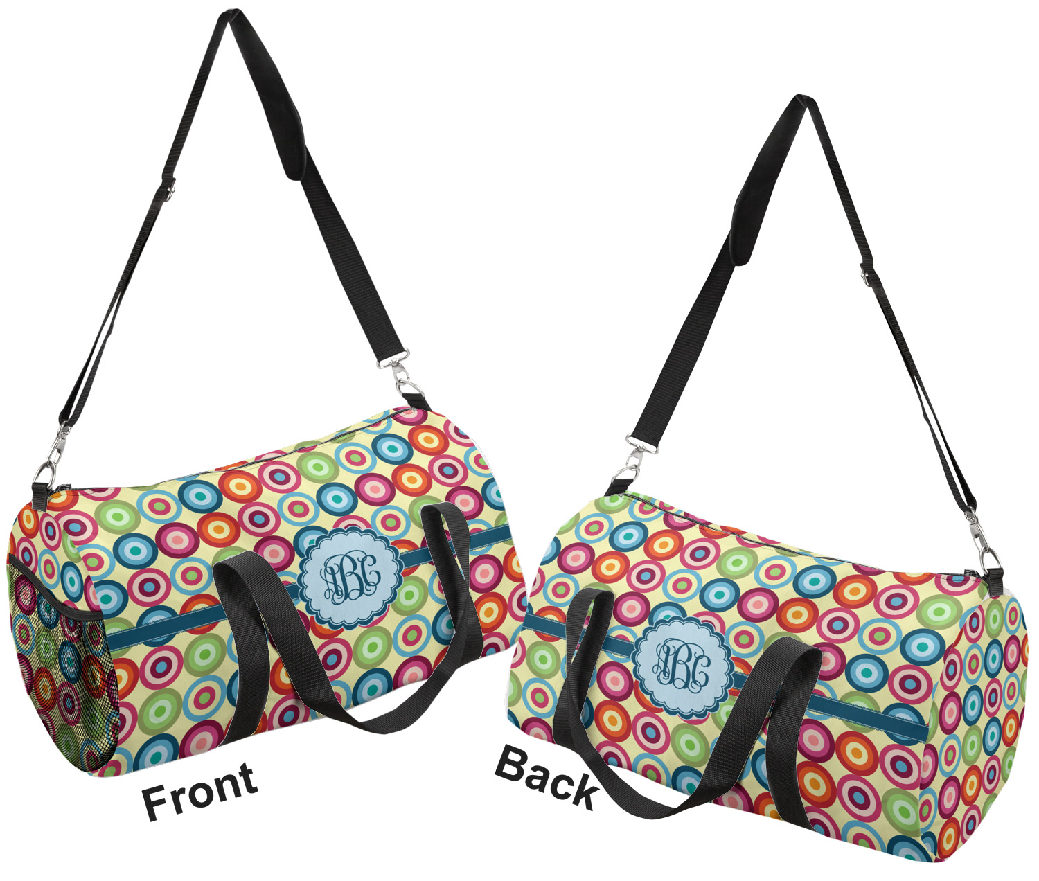 This duffle is a sturdy bag made of a canvas material. It comes in two sizes: Small (19"W x 9.5"H x 9.5"D) and Large (23"W x 12"H x 12"D). The bag is a cylindrical shape with a black adjustable strap and two handles. On one side is an elastic pouch to put a waterbottle or other small item. Your product will be sublimated with your design and is able to be designed on the front, back, and sides. Be sure to remember that the straps may cut into parts of your design if you upload your own artwork.