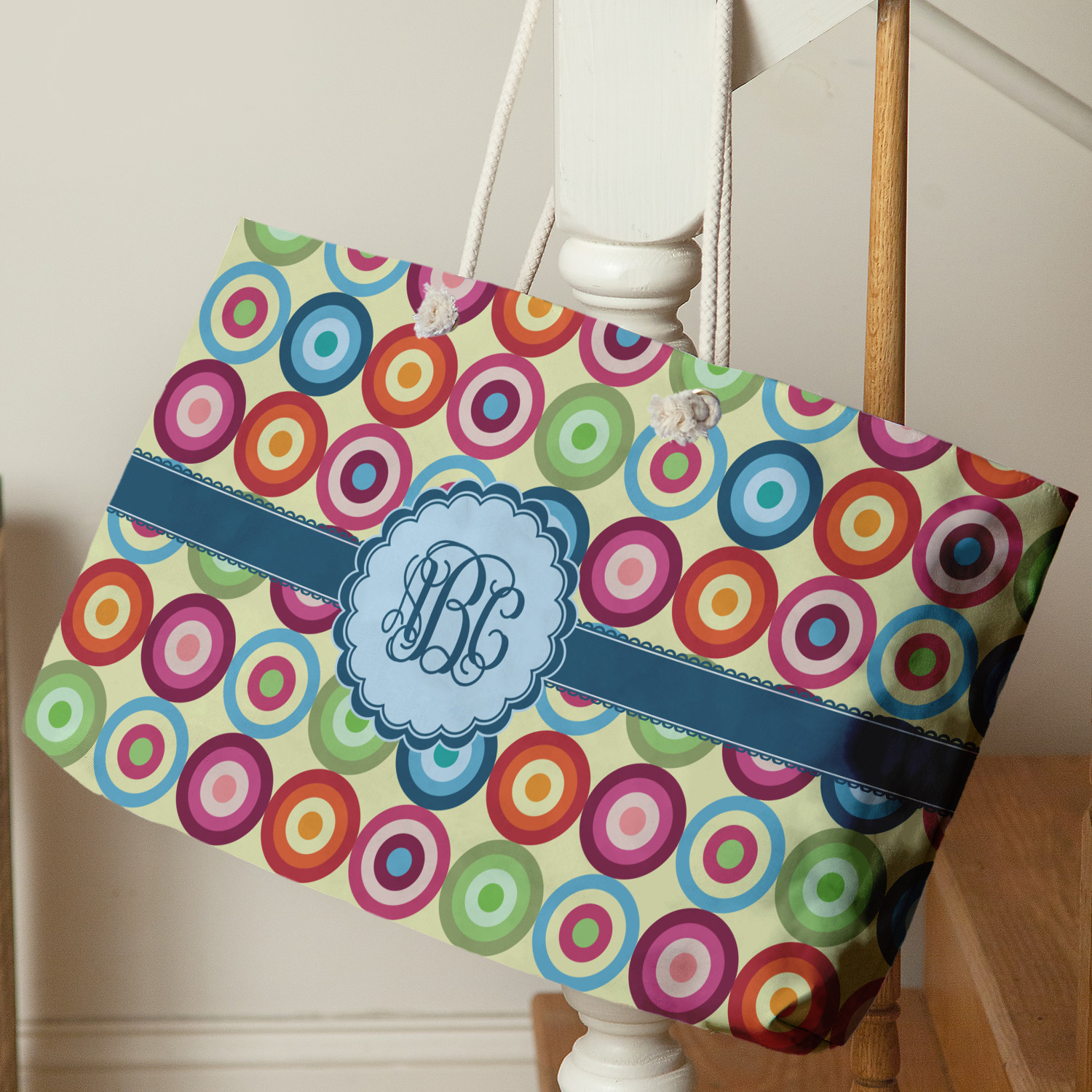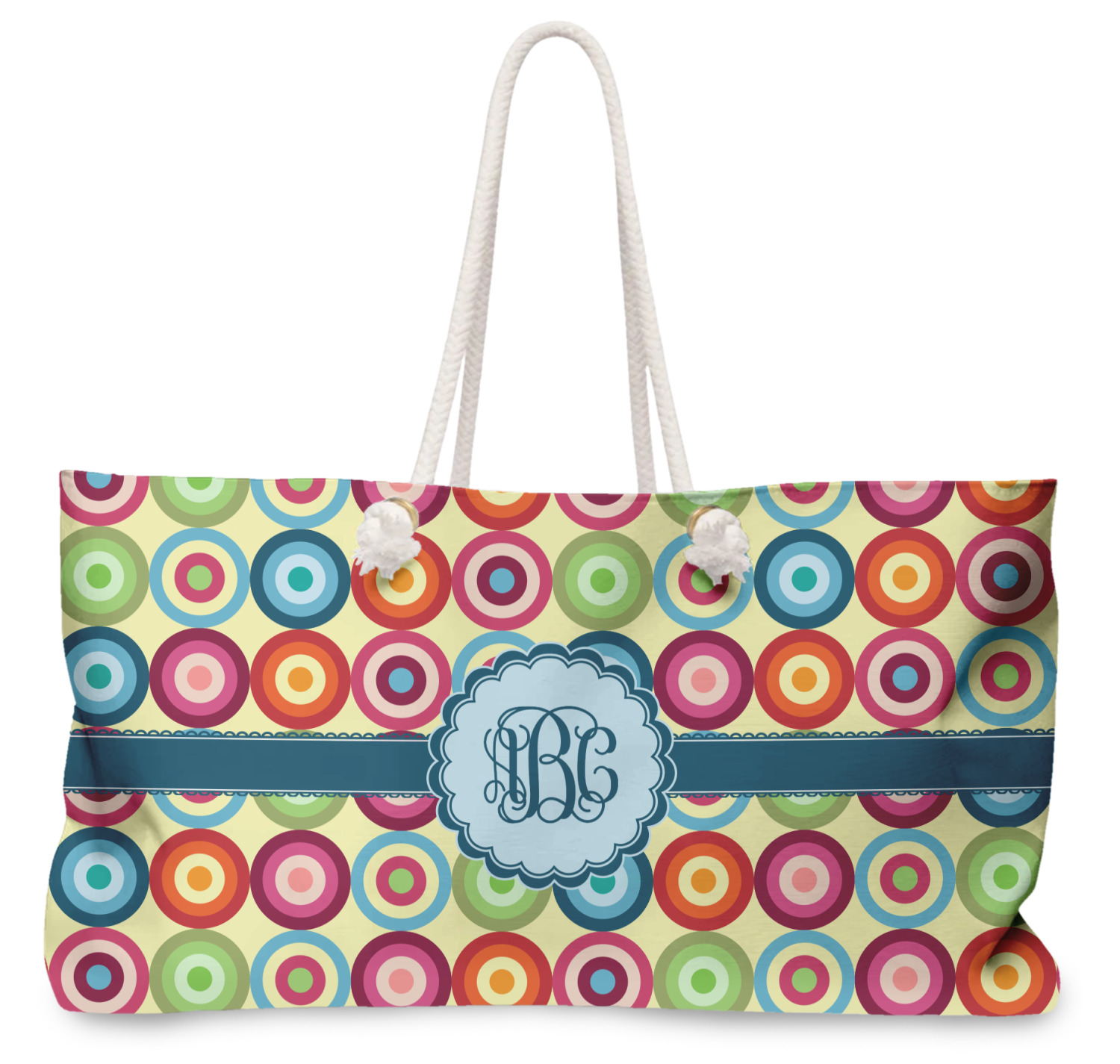 Our oversized weekender tote with rope handles is perfect for your weekend at the beach or on the town. This large tote are 24" W X 13" H, with a 5" gusset and a 27" thick rope handles with a knot that is put through a grommeted brass hole.