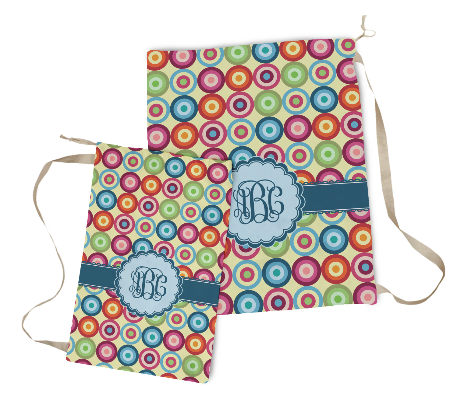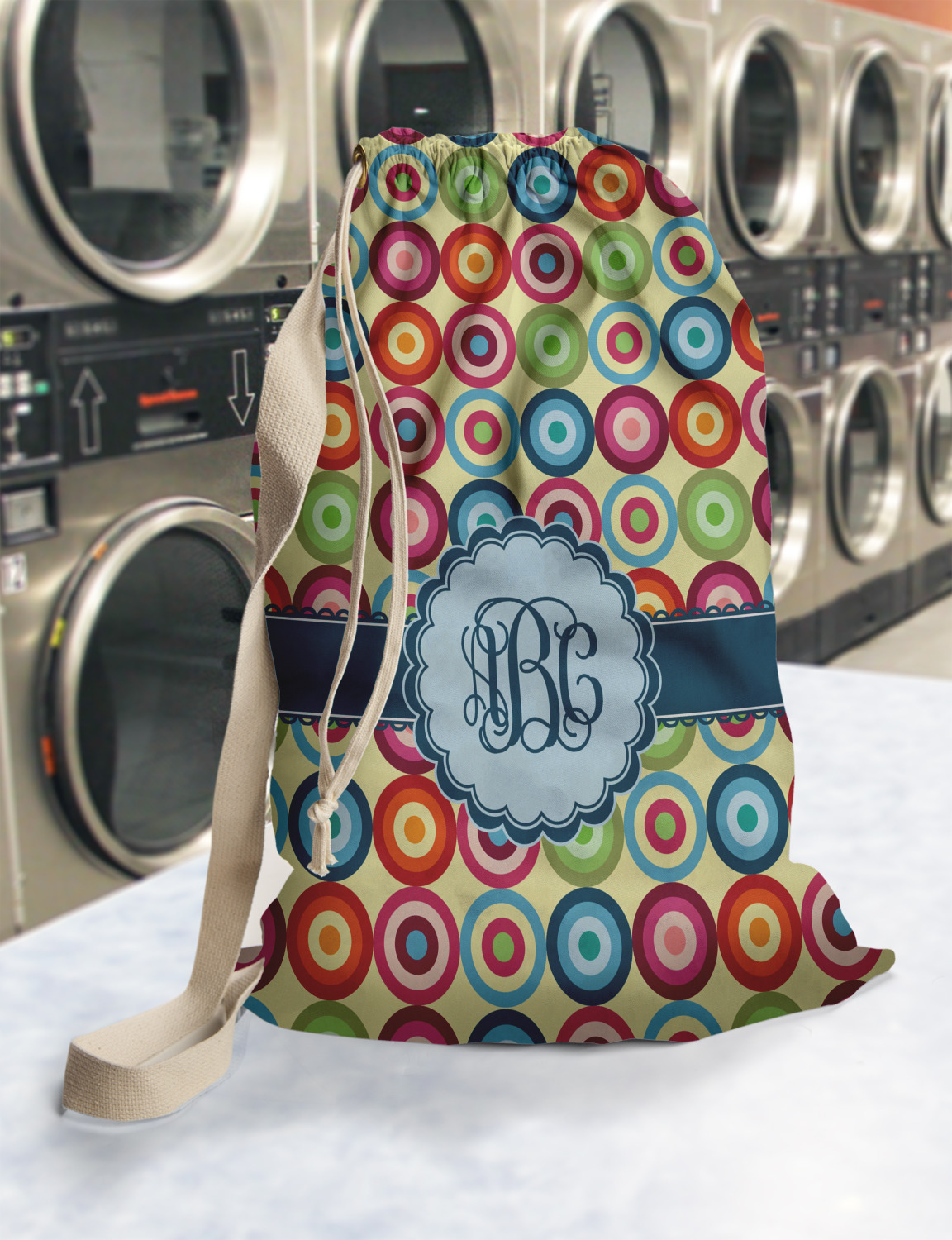 Carry your laundry in style with these customized laundry bags. Available in two sizes, featuring a natural colored woven strap and a cinch cord, these bags hold a lot of clothes or anything else you want to fit in them.