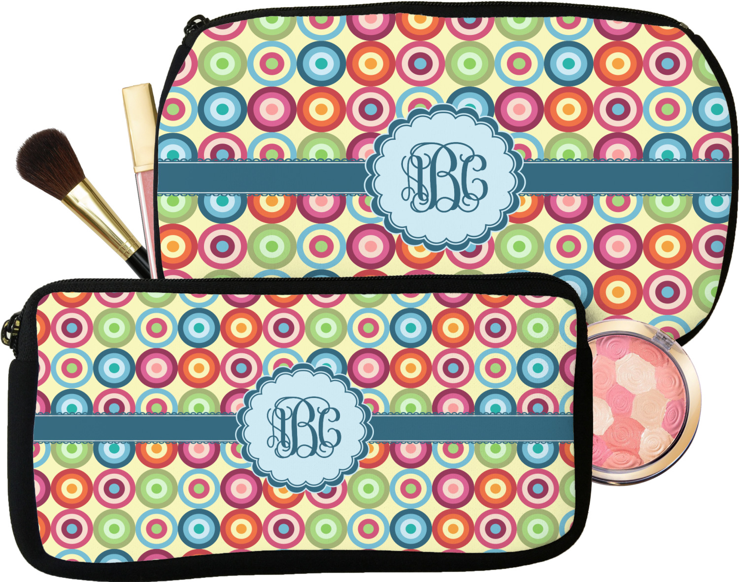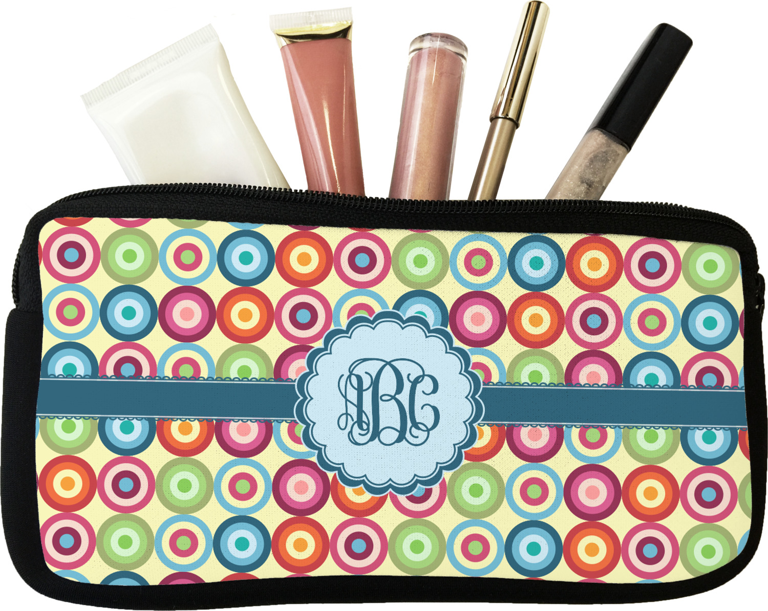 Our personalized makeup bags are available in many different designs, patterns and colors - so you are sure to find one that will love. They are made of neoprene (same material as wet-suits) and thus are water resistant, so spillages in your makeup bag will not end up all over you purse. They are customized on one side and are black on the other side and the zipper is black as well.