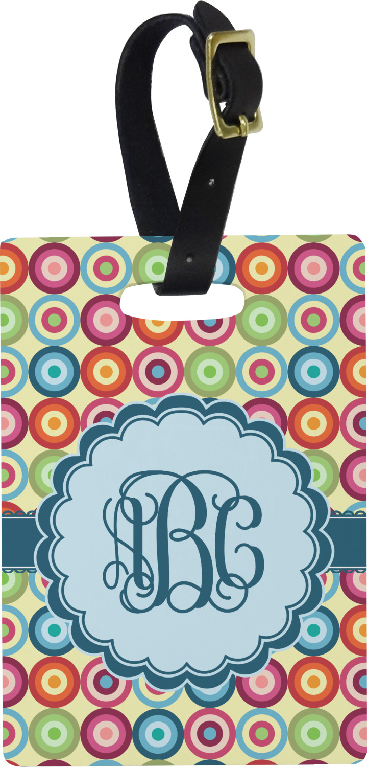These personalized bag tags are sold in a variety of shapes, so that you may find the product that meets your vision exactly. We sell a round luggage tag, which measures at approximately 4" x 4". Our square luggage tag is about 3.5" x 3.5", while our rectangular version is 2.75" x 4 ".