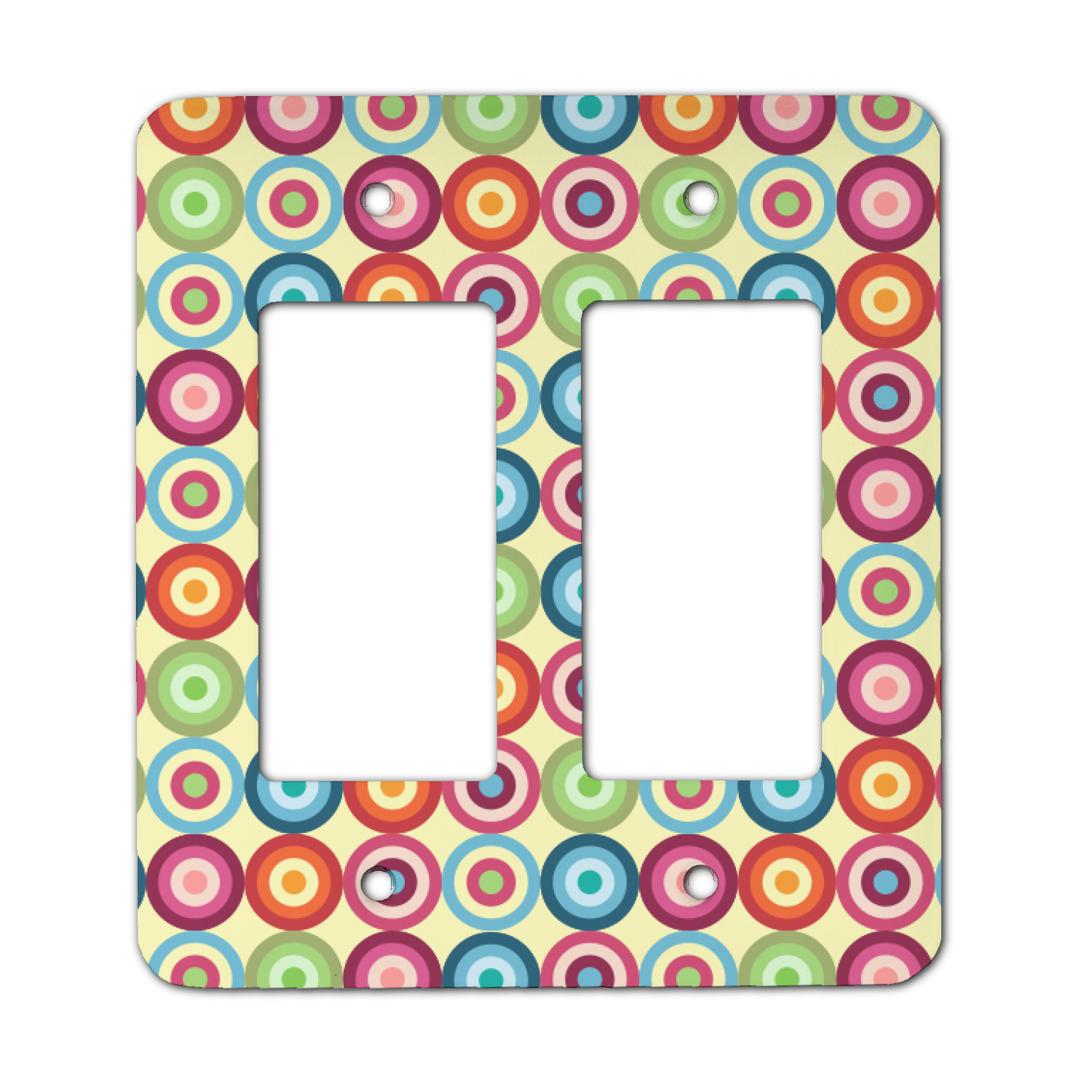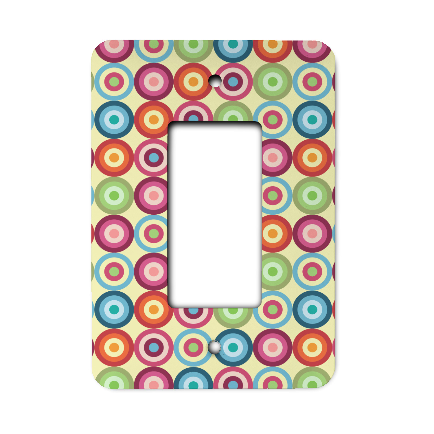 Modern meets retro! If you are looking to combine modern and retro patterns this one is it! This modern circle design has a wonderful multicolored retro look to it, all over a pale, sweet yellow. The background is re-color-able. We chose the retro light yellow, but it can be changed to any of the 100's of colors in our system.