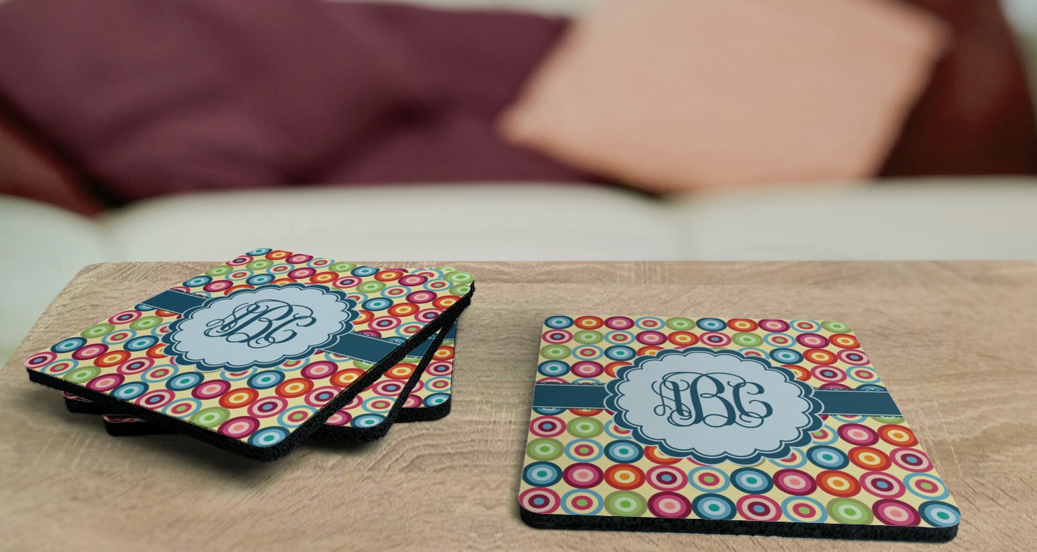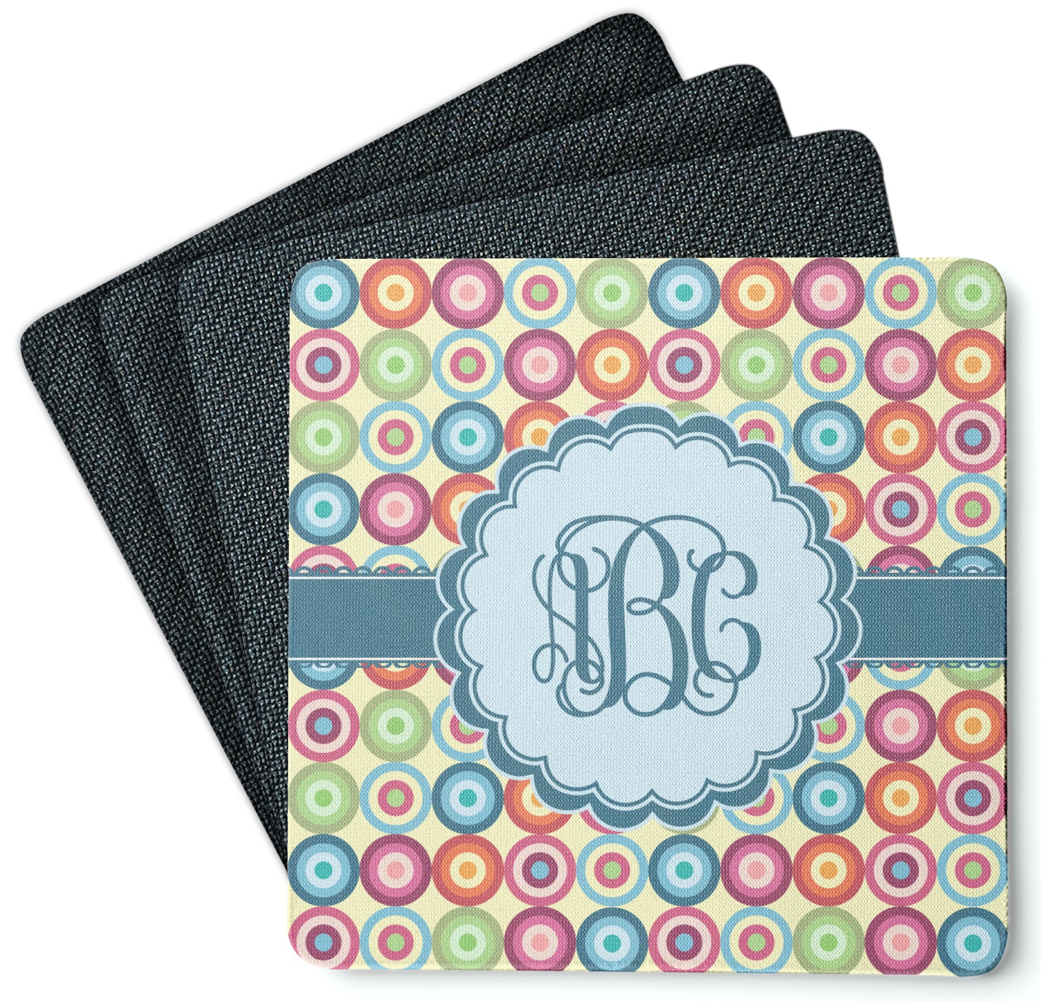 These drink coasters have a smooth, polyester top and a textured, rubber backing on its bottom. The non-slip rubber backing underneath works to keep any spills at bay. At 4 by 4 by 0.25 inches thick, these custom coasters are a suitable size for most drinkware. Your personalization is displayed atop the face of the cup coaster. We sell these rubber coasters in two different shapes: square and round. You can buy each shape as singulars or as a set of 4.