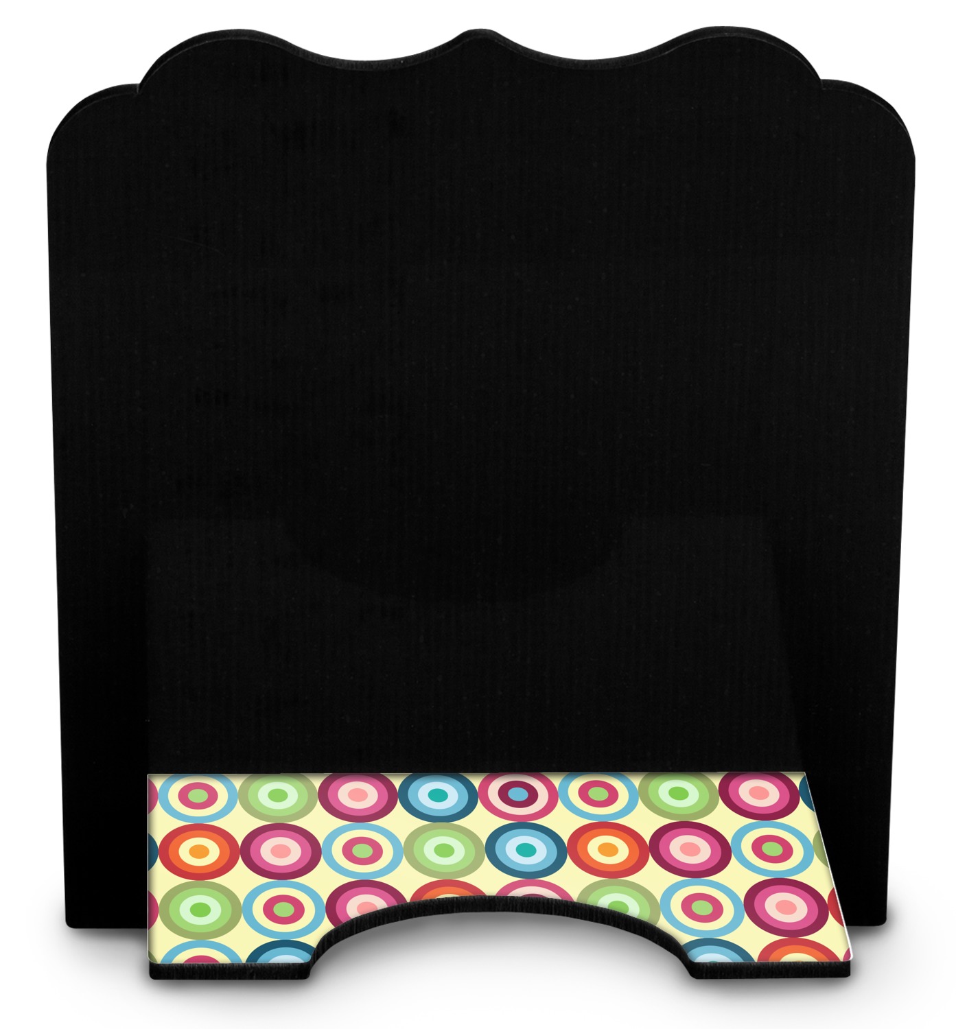 The stand is comprised of two hardboard pieces that fit snugly together and stabilize one another. The bottom part of the iPad stand supports your tablet, and has space for your tablets charger while in use. At 9.25" x 11.5", this tablet mount can support a device between the sizes of the iPad Pro and the iPad Mini 2. The uppermost part of the stand features a decorative, curved edge for a classy, suave appearance. We print your customization atop the face of the stand, in vibrant color. The remaining sides are colored a sleek black.