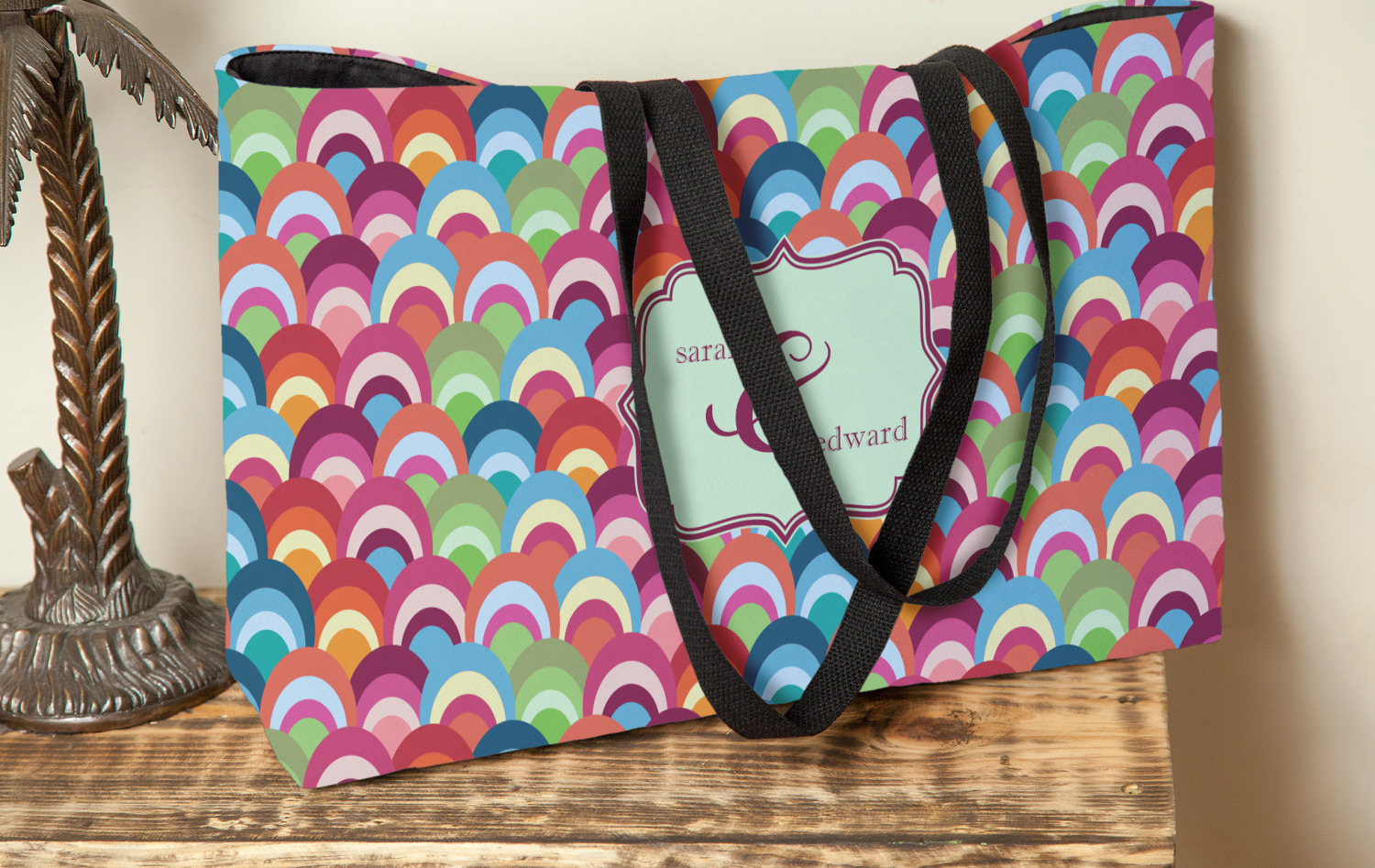 These beach totes are handmade here in the USA. Fabric is printed with your design. The tote is then sewn from the fabric pieces, lining and handles added.