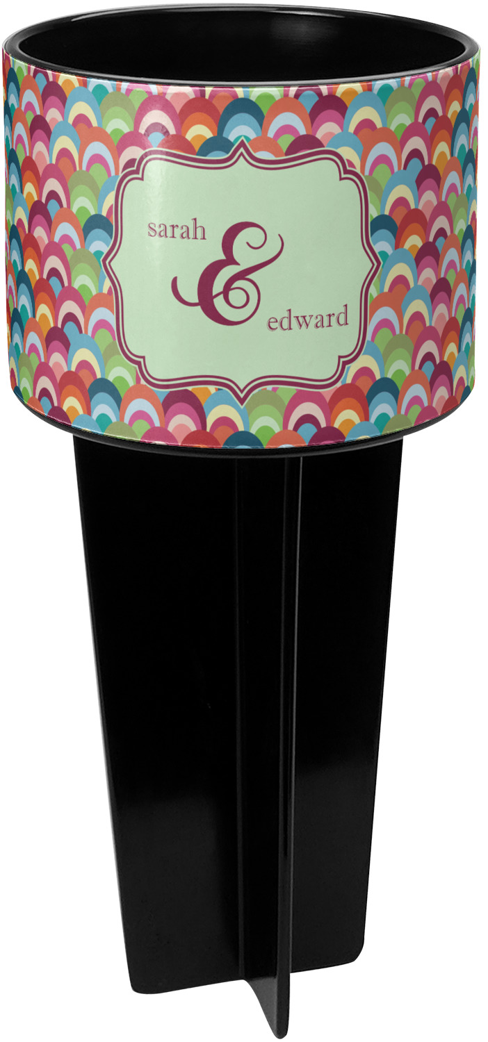 This cup holder has a large stake at its bottom that anchors it to the sand or ground below, while the cup holder rests above the stake. The entire drink holder is made of durable plastic and displays your customization around the cup holder portion. We sell these personalized beach spikers in two different colors: black and white.