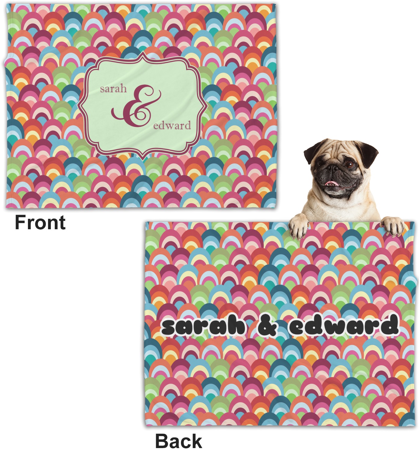 These dog blankets are crafted from a gentle, soft-to-the-touch, minky material. We print your customizations, either matching or differing, on both the top and underside of the blanket. These personalized dog blankets are available in two sizes: regular and large. Our regular size, at 40" x 30", accommodates small and some medium size dogs. At 60" x 50", our large dog blanket is a better fit for bigger breeds. Though specialized for dogs, these blankets still make a thoughtful gift for your favorite feline, or any other pet in mind!