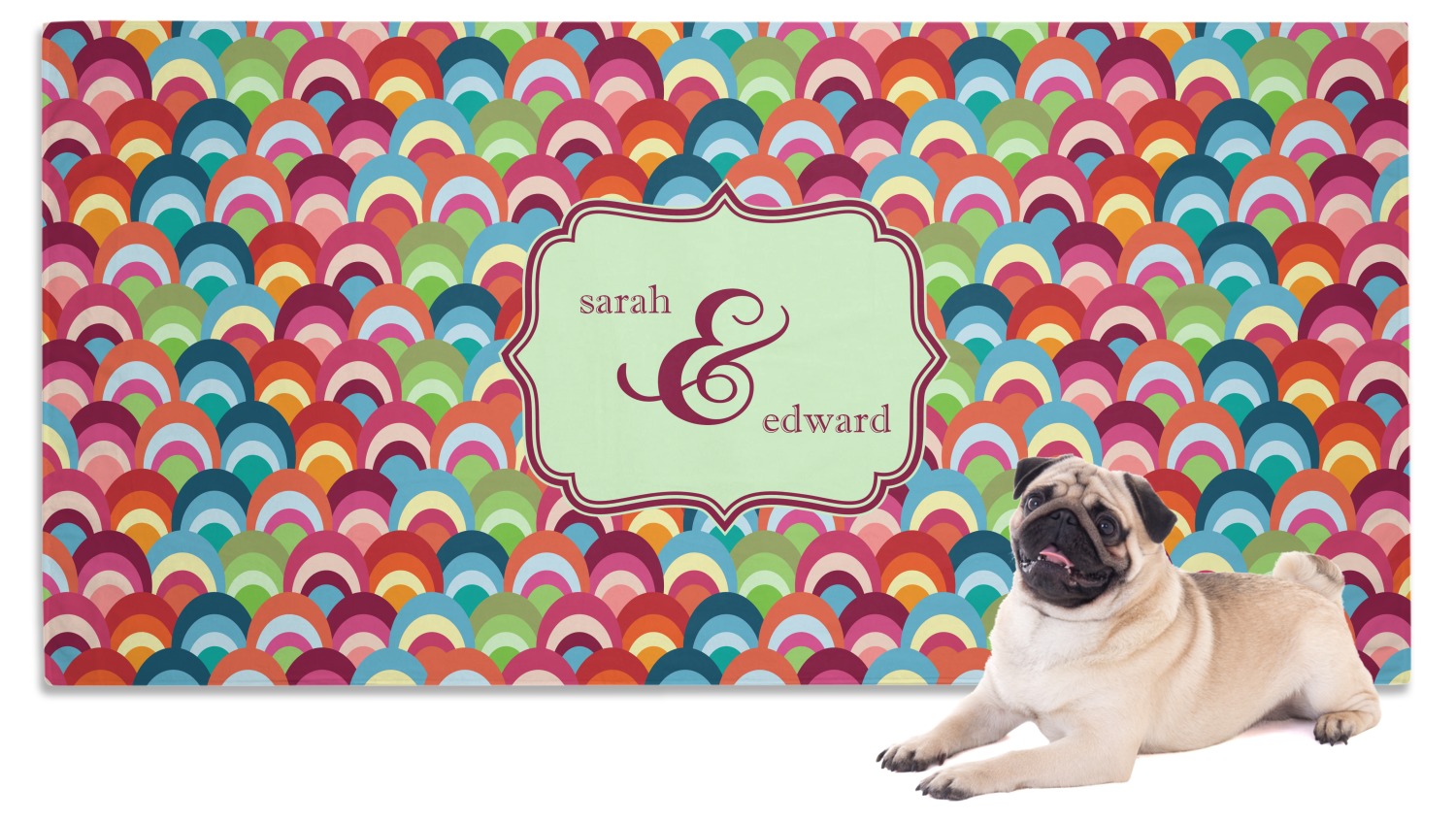Our custom towels are crafted from a special blend of polyester and polyamide, which contributes to its lightweight, yet thoroughly absorbent nature. We craft it as such to guarantee efficiency as a convenient product; its lightweight nature makes it easy to roll up and carry along, yet it is still able to dry off even the wettest, muddiest pet. It measures at 60" x 30" and is sizable enough to dry off even the largest of pets. With our towel's gentle, soft-to-the-touch material, your pet will be sure to anticipate its warm, dry embrace. We print your personalized design on the front of the towel, while the back is white.