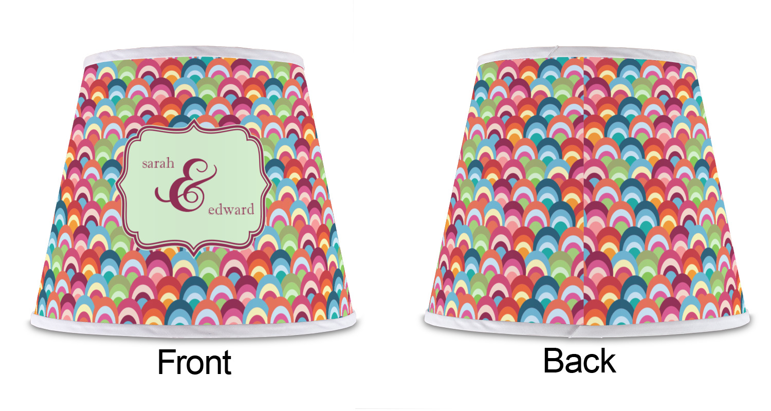 The base of this lampshade is 12 inches in diameter, and the top spans 8 inches in diameter. The total height of the lampshade is 10 inches. The angled nature of this custom lampshade concentrates the light, making it ideal for smaller spaces. This lampshade is made of matte, polyfilm, and displays your customization in its middle. The top and bottom of this colorful lamp shade are lined with a white fabric ribbon (which can be replaced with black inside the design studio) which frames your design and creates a sophisticated finish. As an UNO fitter lampshade, this unique lamp shade will fit a variety of bases.