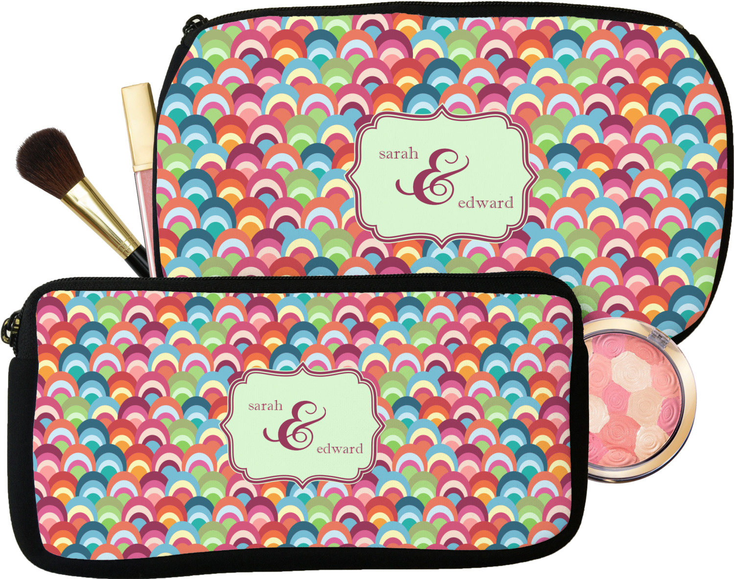 Our personalized makeup bags are available in many different designs, patterns and colors - so you are sure to find one that will love. They are made of neoprene (same material as wet-suits) and thus are water resistant, so spillages in your makeup bag will not end up all over you purse. They are customized on one side and are black on the other side and the zipper is black as well.