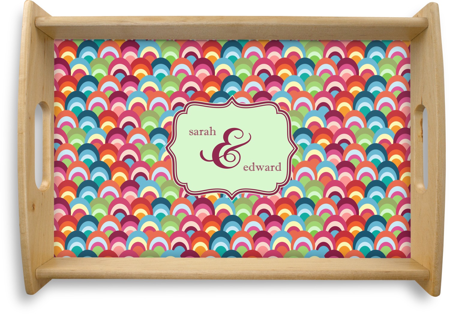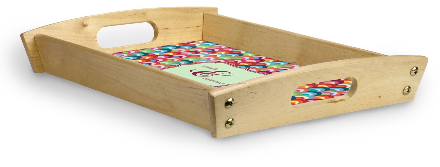 This serving tray with handles features square edges and two rounded sides, creating a very modern look. Each side is fabricated from a beautifully cut, natural wood. The bottom of the interior of the tray displays your customized design in bright, vibrant color. The tray is sold in both a black color and a natural wood look. Each variation of the wood serving tray has two sizes: Small, which is 14" x 10" x 2.25", and Large, which is 19.5" x 13.5" x 2.75".