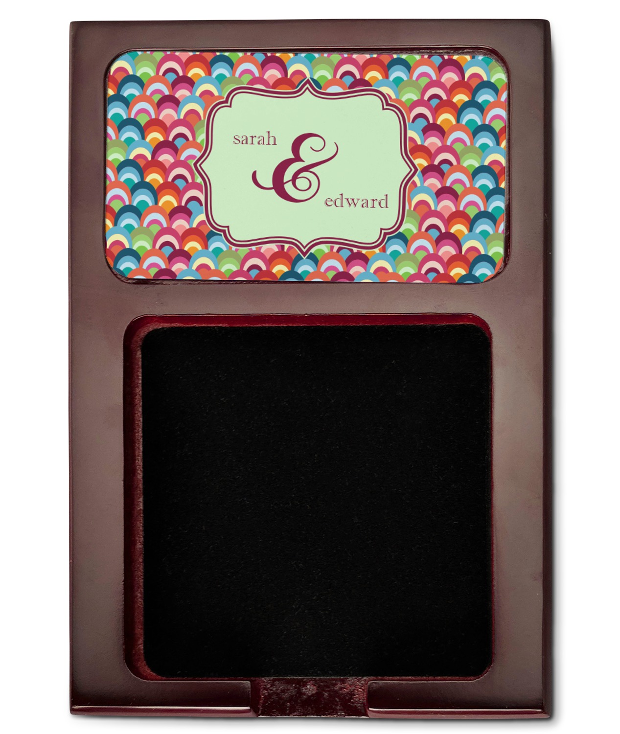 Crafted from a fine mahogany, this post it note holder is in the shade of a dark, cherry color. The dispenser itself is about 4.25 by 6.25 by 0.75 inches. You can place your 3 by 3 inch sticky notes in the indentation below the nameplate. We print your customization onto the nameplate that rests above the velvety indentation.
