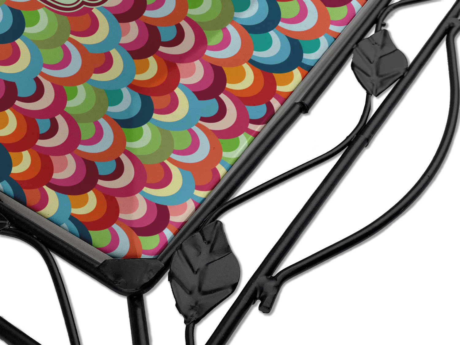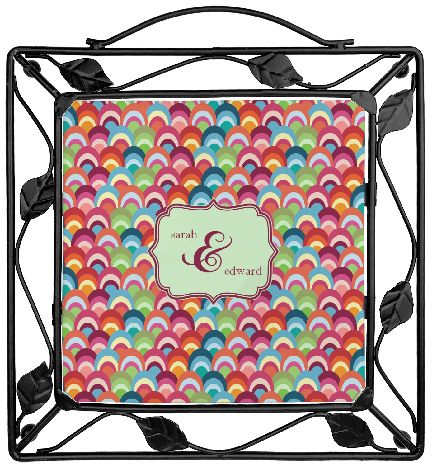 Our square trivets are made from a durable, wrought iron. This model features 4 small half circles, one on each corner, and a larger ring of iron that circles the central, customized tile. Each of the 4 corners has a round foot on its bottom for stability. This trivet is 8.75 by 8.75 inches, but the central tile measures at 6 inches on both sides.