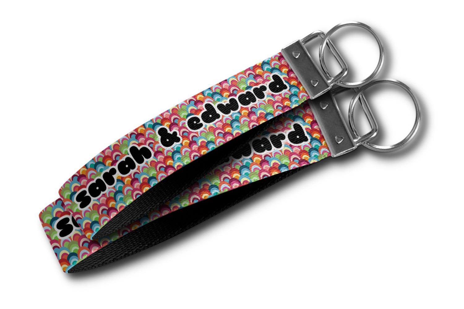These key fob keychains are made from a polyester weave, right here in the USA. They feature a silver, metal clasp, attached to a round keyring. The piece gives the personalized wristlet a beautiful, finished look. Your customized design is printed on the outside of the keychain strap. We carry these wristlets in two sizes: small, which is 5 inches in width, and large, which is 5.5 inches in width.