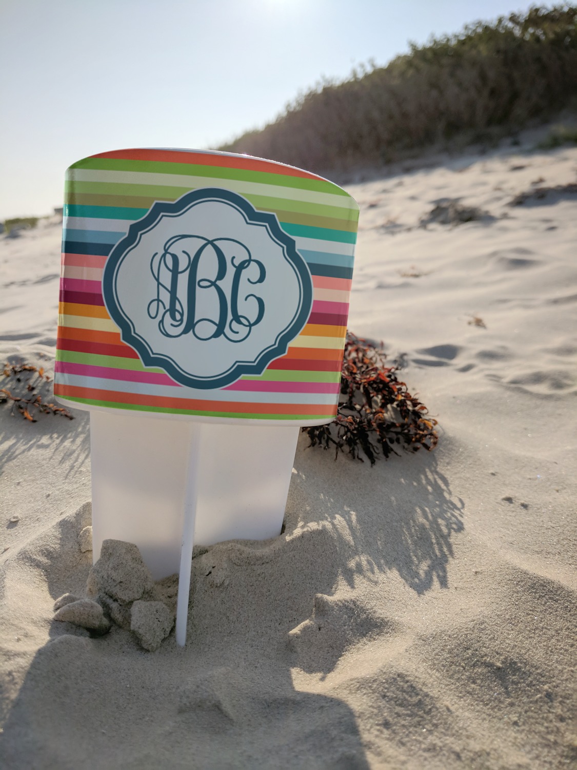 This cup holder has a large stake at its bottom that anchors it to the sand or ground below, while the cup holder rests above the stake. The entire drink holder is made of durable plastic and displays your customization around the cup holder portion. We sell these personalized beach spikers in two different colors: black and white.