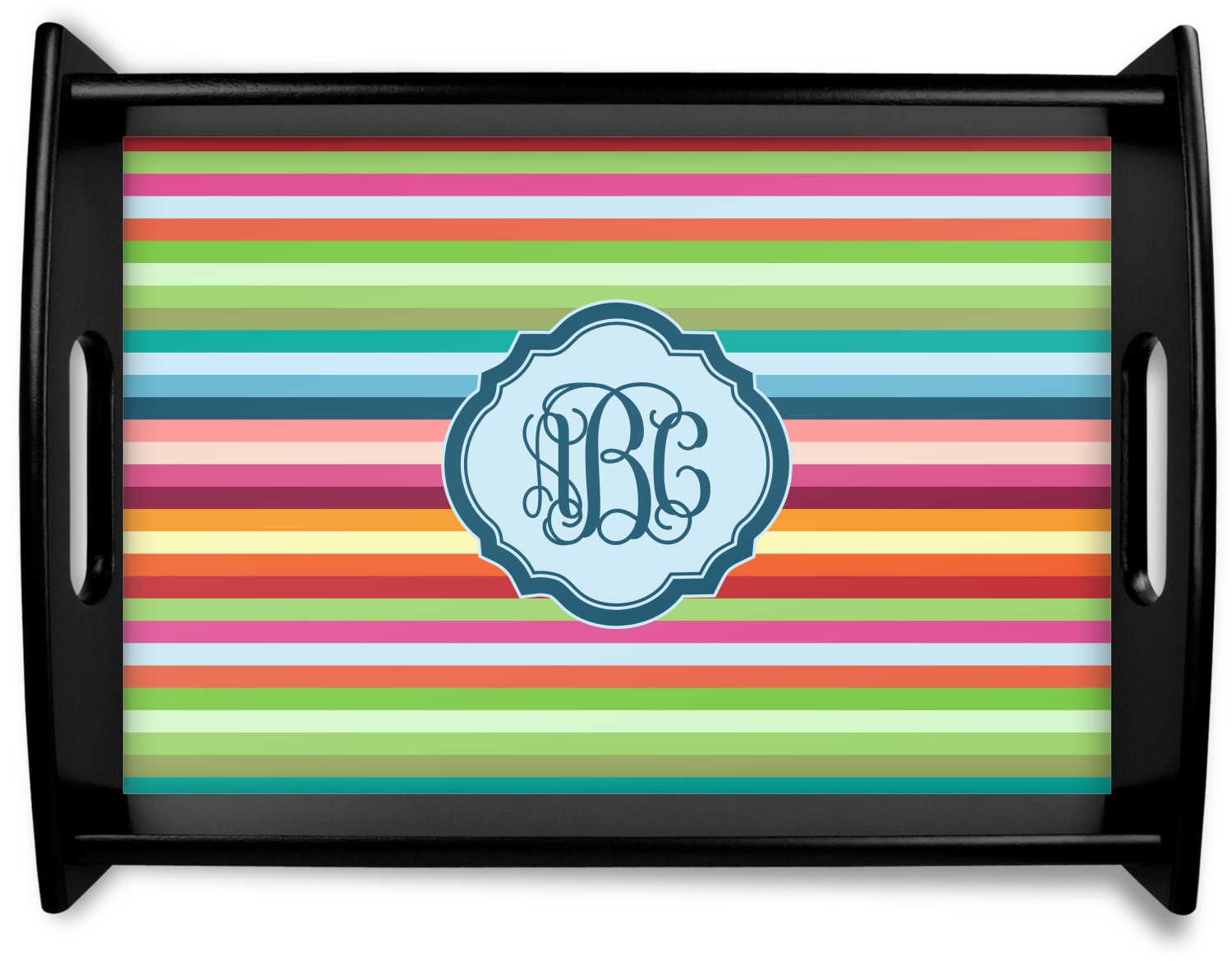 This serving tray with handles features square edges and two rounded sides, creating a very modern look. Each side is fabricated from a beautifully cut, natural wood. The bottom of the interior of the tray displays your customized design in bright, vibrant color. The tray is sold in both a black color and a natural wood look. Each variation of the wood serving tray has two sizes: Small, which is 14" x 10" x 2.25", and Large, which is 19.5" x 13.5" x 2.75".