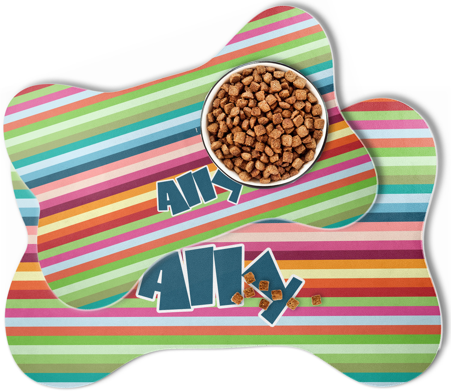 The top of this mat displays your custom design, as it is printed on polyester. To prevent slippage, the underside of the mat is made of rubber. We offer a small dog food mat, suitable for smaller dogs and a large dog food mat for bigger breeds. The small dog food mat is approximately 19 by 13 inches, while the large dog feeding mat measures at approximately 26.75 by 18 inches. Both personalized mats are ideally sized to fit two dog bowls.