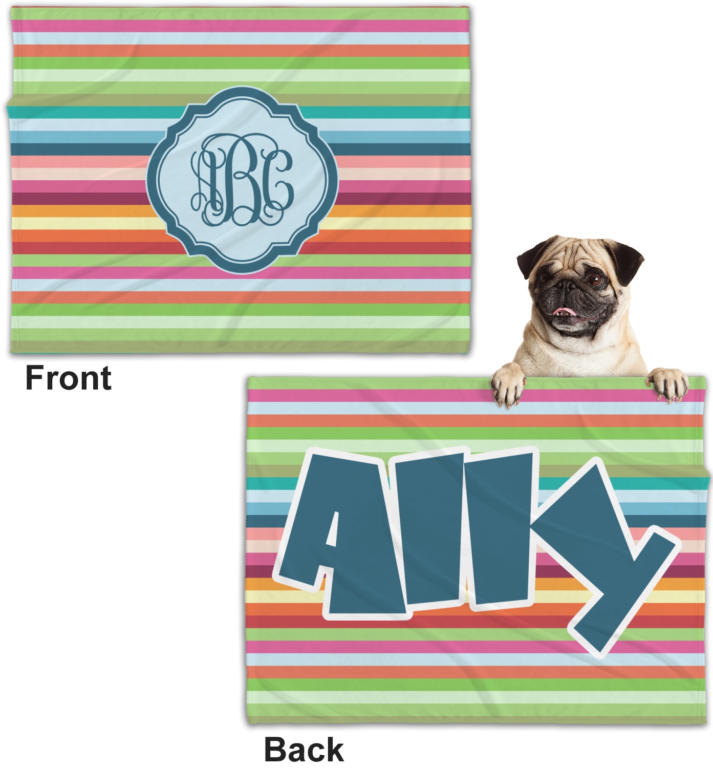 These dog blankets are crafted from a gentle, soft-to-the-touch, minky material. We print your customizations, either matching or differing, on both the top and underside of the blanket. These personalized dog blankets are available in two sizes: regular and large. Our regular size, at 40" x 30", accommodates small and some medium size dogs. At 60" x 50", our large dog blanket is a better fit for bigger breeds. Though specialized for dogs, these blankets still make a thoughtful gift for your favorite feline, or any other pet in mind!
