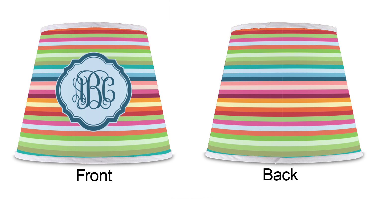 The base of this lampshade is 12 inches in diameter, and the top spans 8 inches in diameter. The total height of the lampshade is 10 inches. The angled nature of this custom lampshade concentrates the light, making it ideal for smaller spaces. This lampshade is made of matte, polyfilm, and displays your customization in its middle. The top and bottom of this colorful lamp shade are lined with a white fabric ribbon (which can be replaced with black inside the design studio) which frames your design and creates a sophisticated finish. As an UNO fitter lampshade, this unique lamp shade will fit a variety of bases.