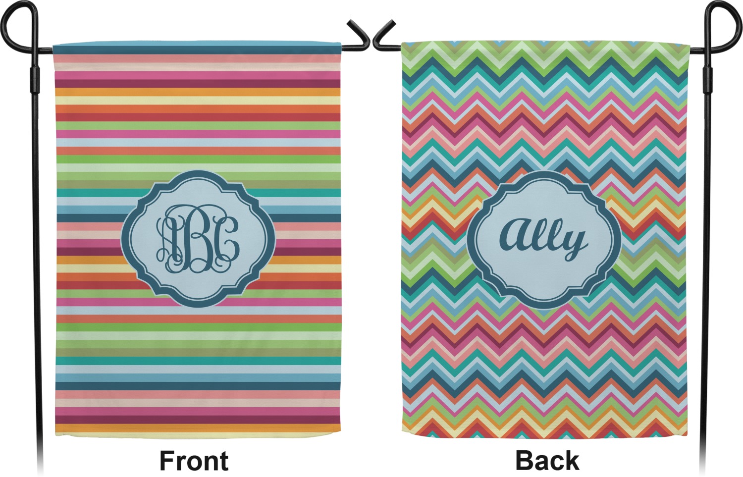 These custom garden flags are made of a durable, double-ply, polyester weave, allowing them to withstand the elements year round. The small flags measure at approximately 12 by 18 inches. The large flags measure out to 28 by 37 inches. You can order these decorative flags with your customization printed on the front only, or the front and back.