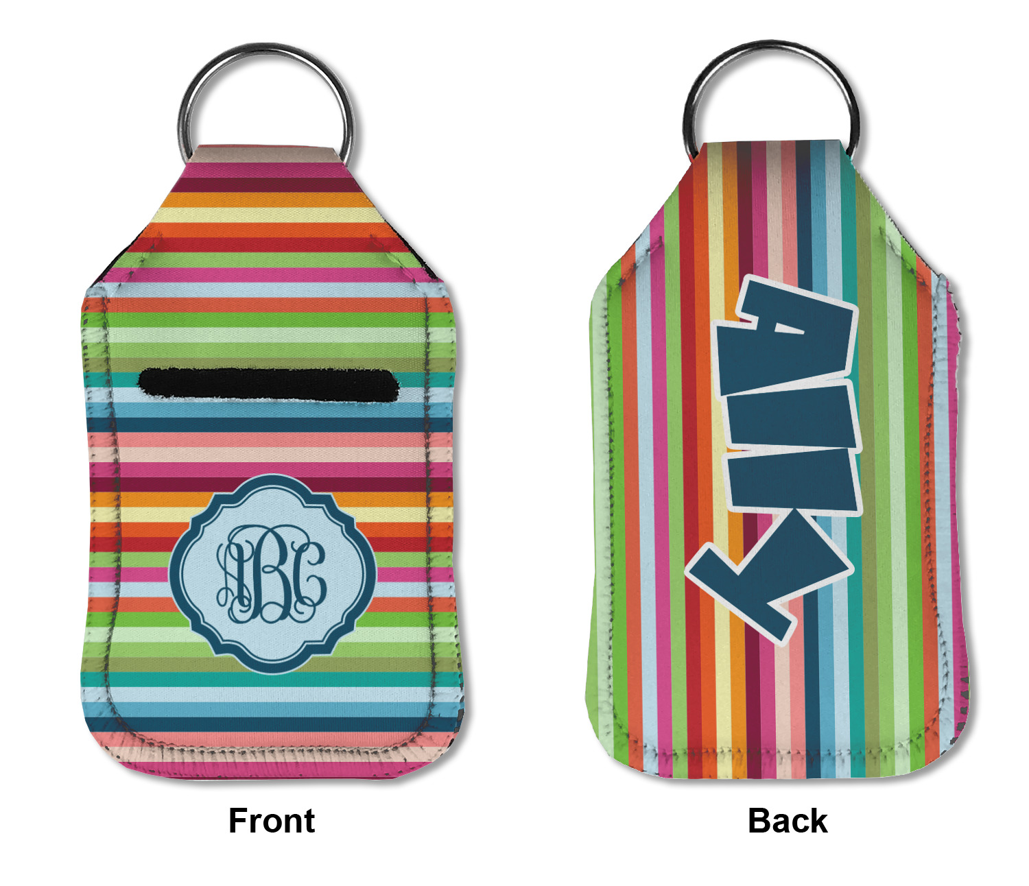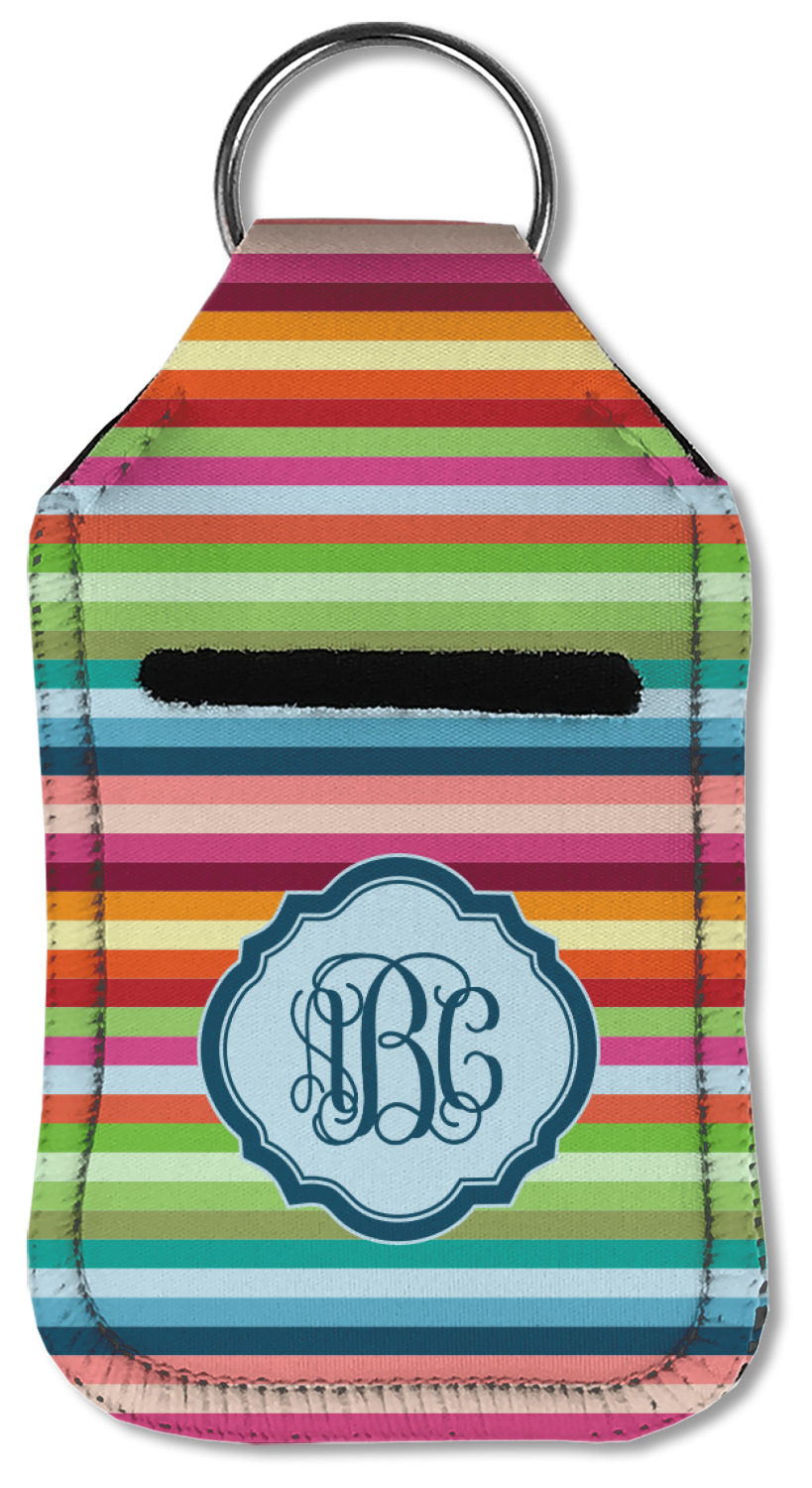Each hand sanitizer holder comes with its own empty travel-sized, refillable hand sanitizer sure to fit snug in your customized sanitizer case! Our hand sanitizer cases are a durable, yet soft neoprene material sure to last any daily activities or travel agenda. Customize and personalize a hand sanitizer bottle holder with one of our two sizes - small (4.25" x 2.25") or large (5.5" x 2.5"). Each travel sanitizer holder comes with a keyring for attachment on bags, keys, or more!