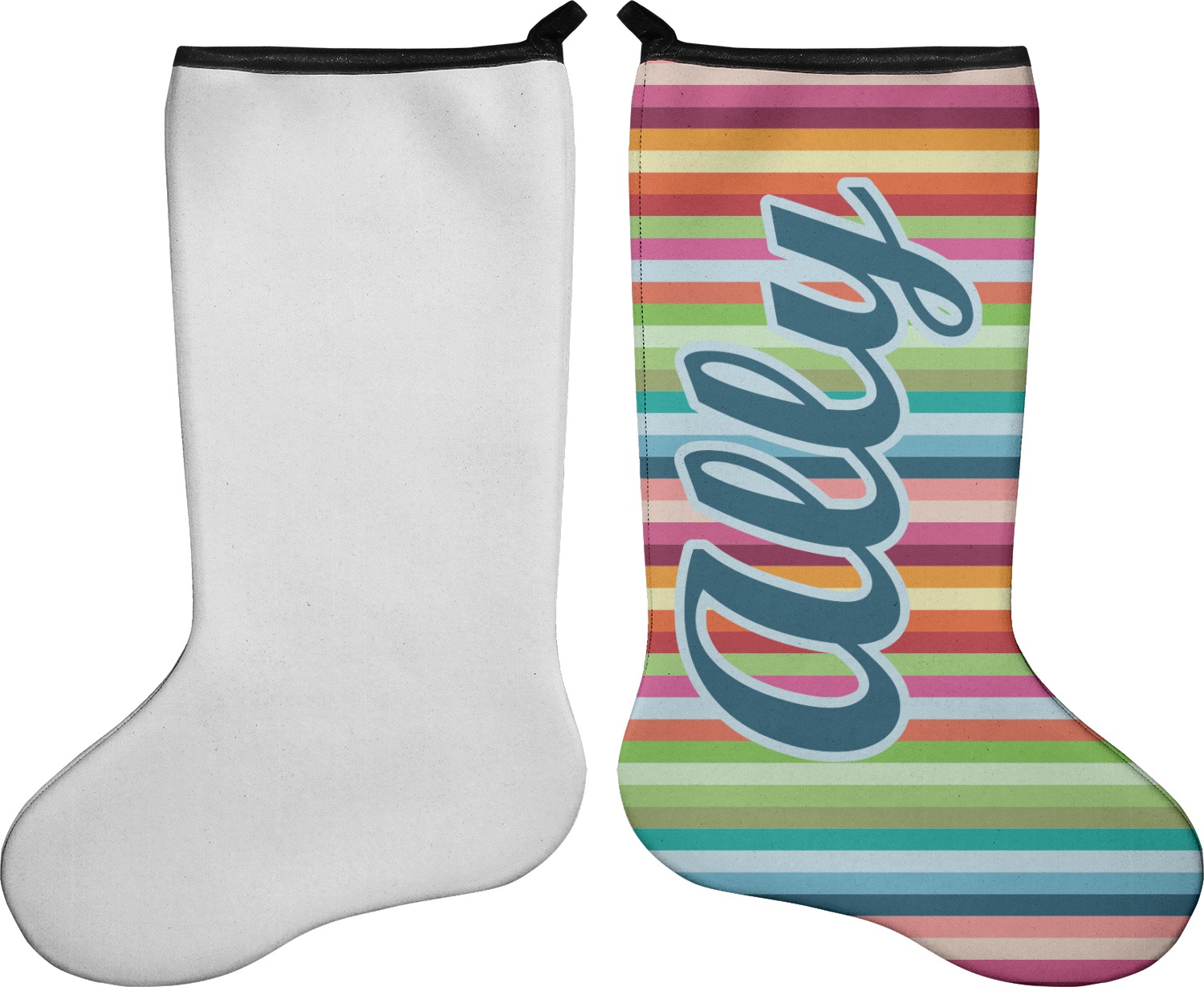 These 17" x 11" stockings are made of neoprene and have a black trim to give them a fantastic finished look. Your very own design is printed right onto the stocking, either single sided with white on the back or double sided where can use the same or different designs / patterns on the front and the back - the choice is yours. At the top of the stocking is a 2" loop for hanging.