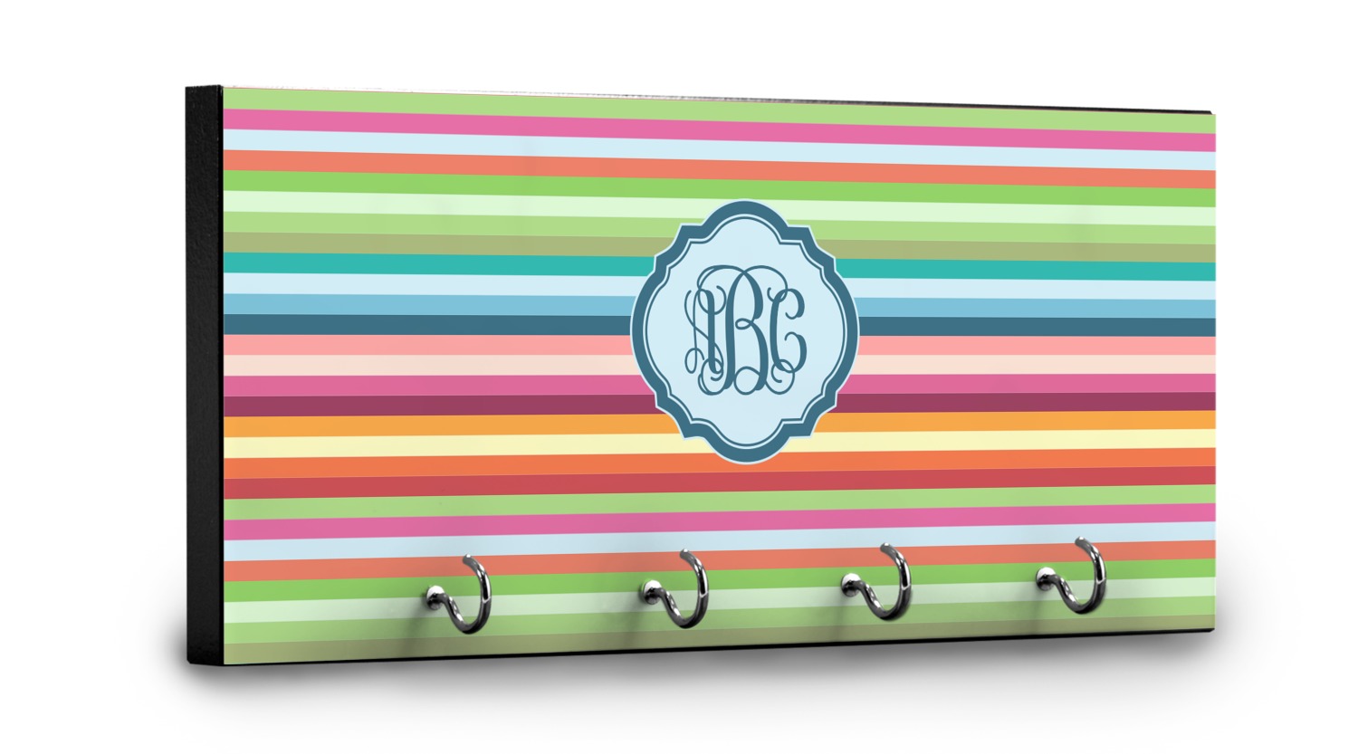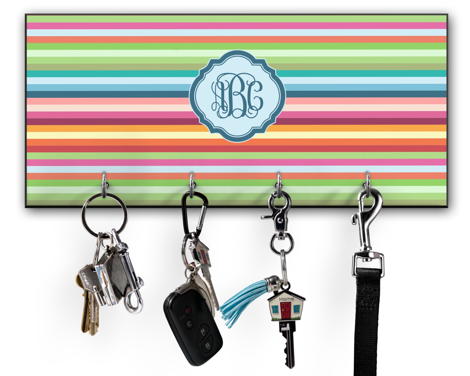 This 11" x 5" key hanger is made of sturdy wood and has four metal hooks lining the bottom. This is the perfect size for a family with several drivers. Not only can you hang keys on it though, but pet leashes and other small items. The board is black on the sides and back and is printed with the design of your choice on the front.