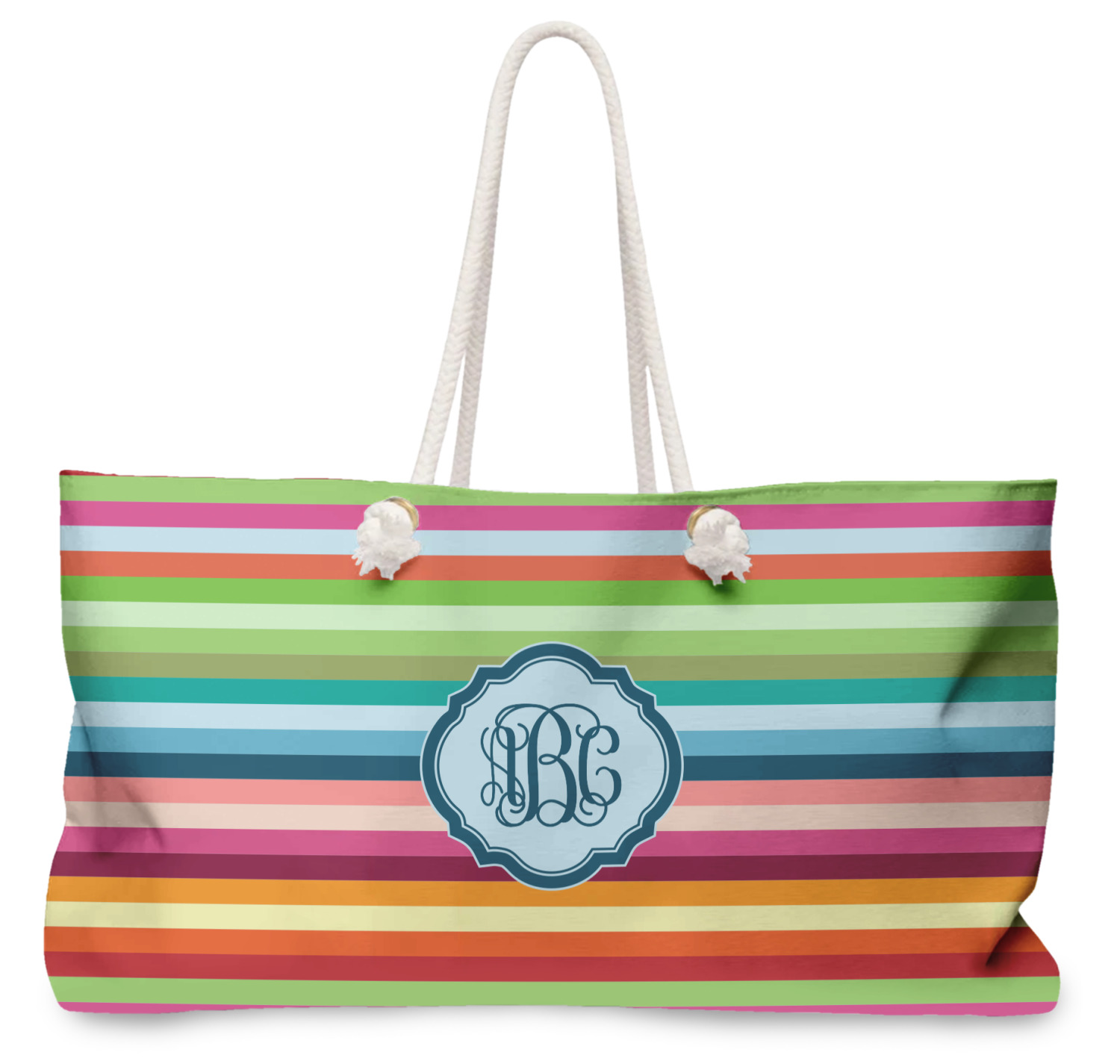 Our oversized weekender tote with rope handles is perfect for your weekend at the beach or on the town. This large tote are 24" W X 13" H, with a 5" gusset and a 27" thick rope handles with a knot that is put through a grommeted brass hole.