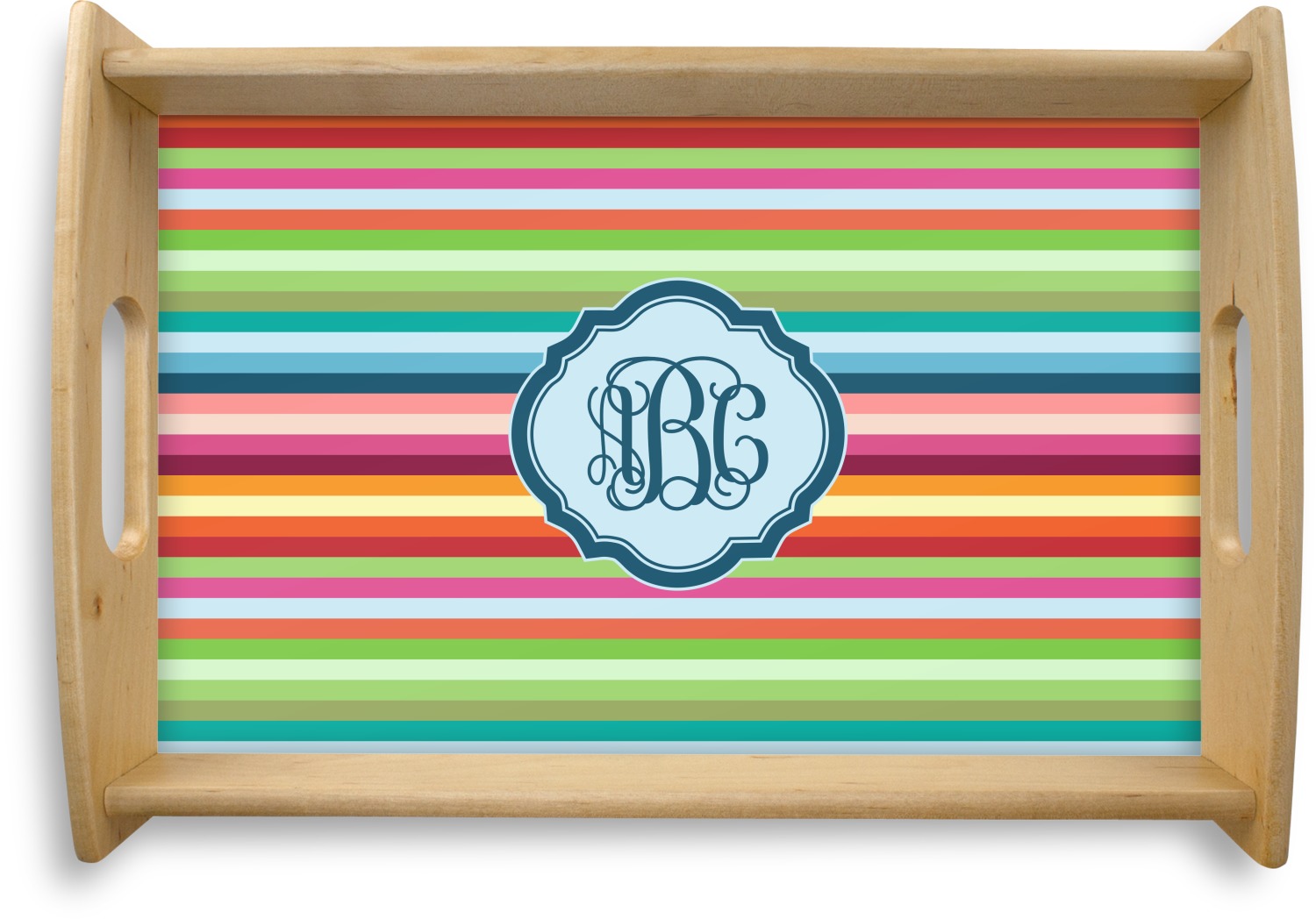 This serving tray with handles features square edges and two rounded sides, creating a very modern look. Each side is fabricated from a beautifully cut, natural wood. The bottom of the interior of the tray displays your customized design in bright, vibrant color. The tray is sold in both a black color and a natural wood look. Each variation of the wood serving tray has two sizes: Small, which is 14" x 10" x 2.25", and Large, which is 19.5" x 13.5" x 2.75".