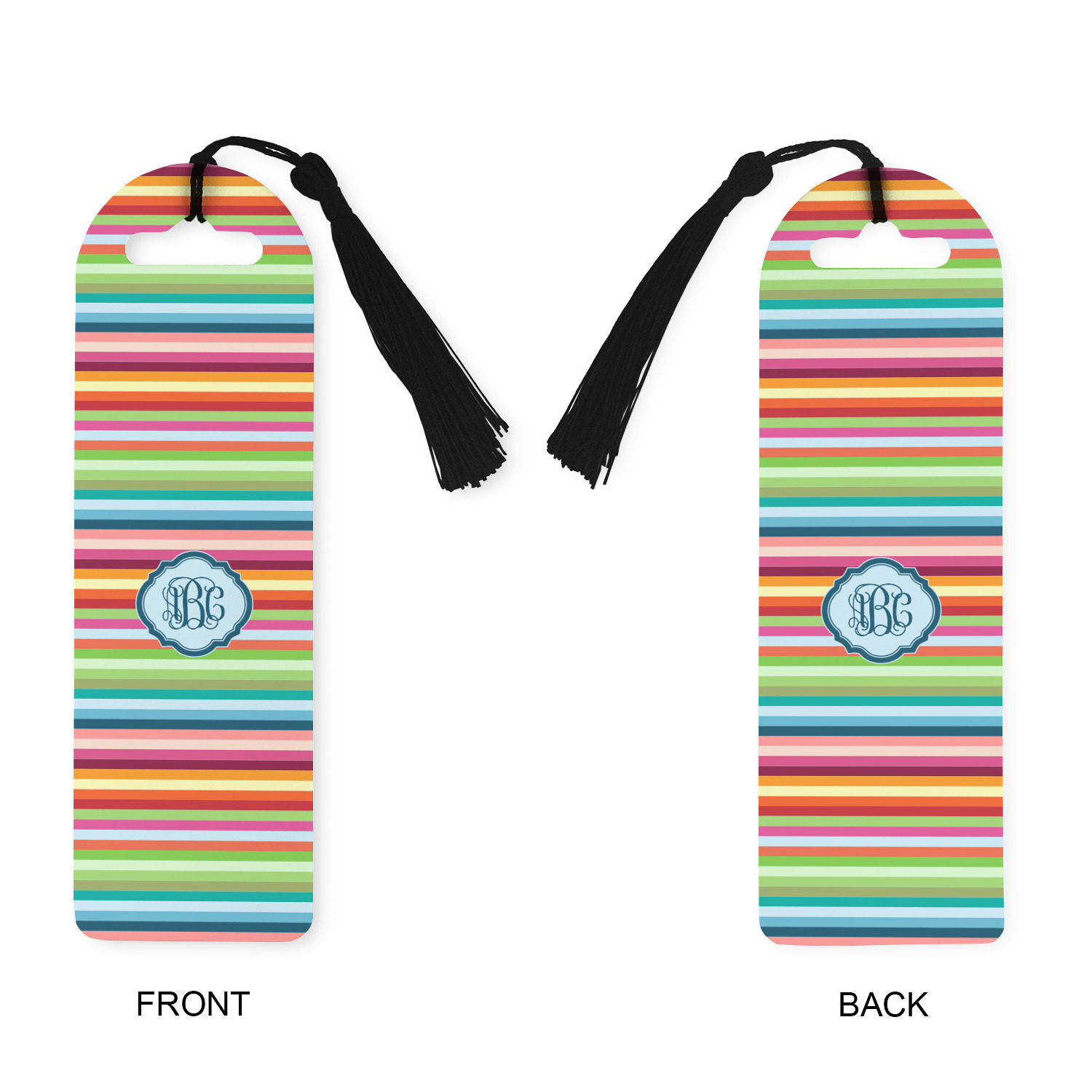 Made from a durable, flexible plastic, these bookmarks are printed with your custom design on them. With the tassel on them they make it easy to find your page in your book. These are a rectangular shape 7 1/4 inches tall with a rounded top and are approximately 2 1/4 inches wide.
