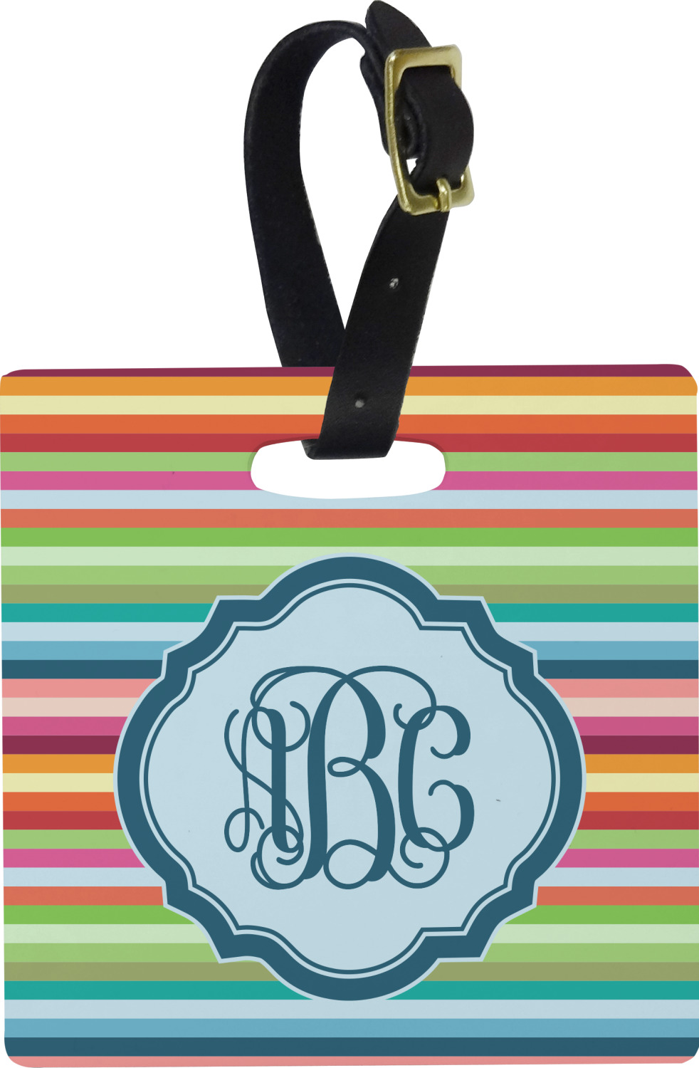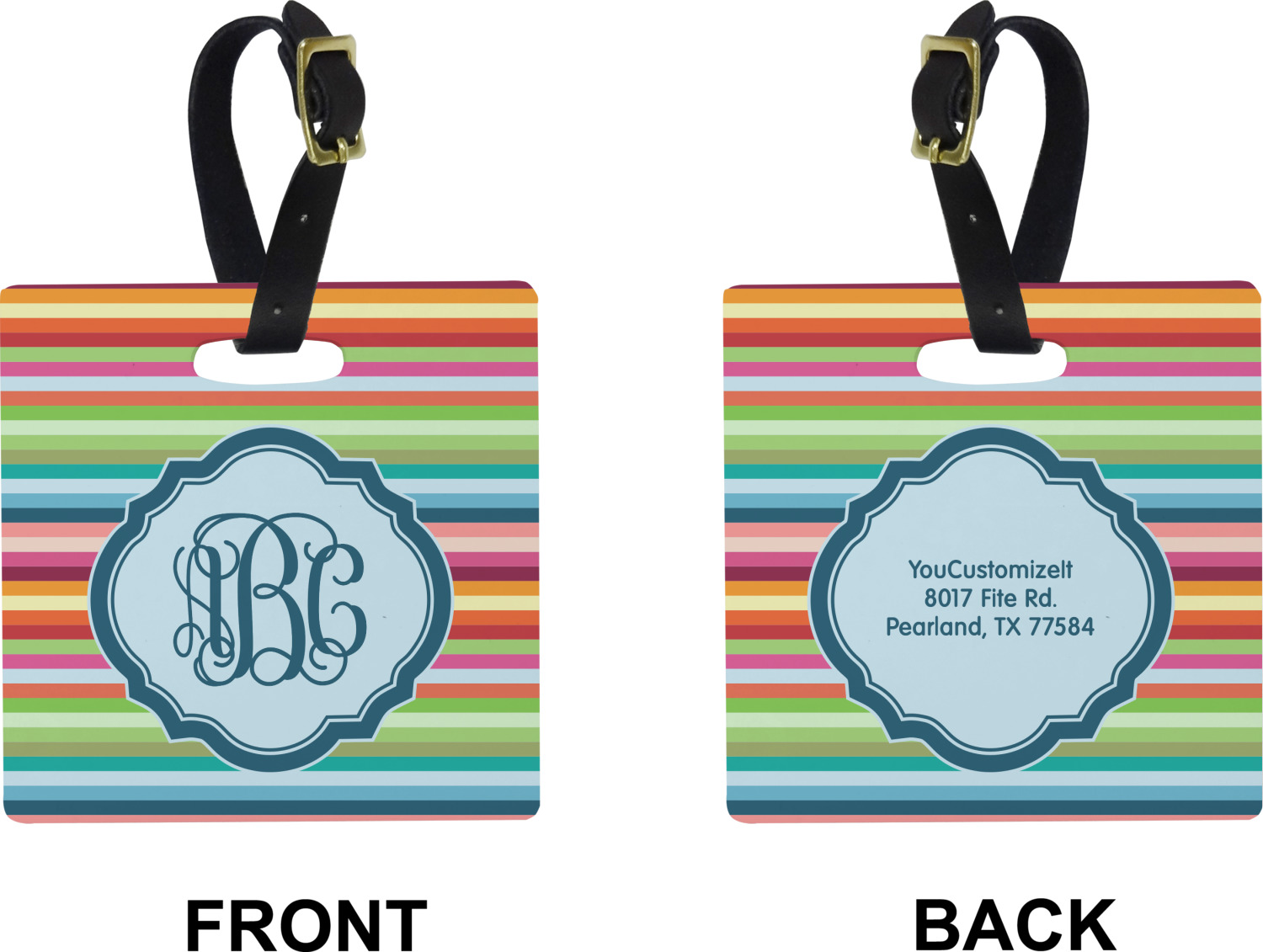 These personalized bag tags are sold in a variety of shapes, so that you may find the product that meets your vision exactly. We sell a round luggage tag, which measures at approximately 4" x 4". Our square luggage tag is about 3.5" x 3.5", while our rectangular version is 2.75" x 4 ".