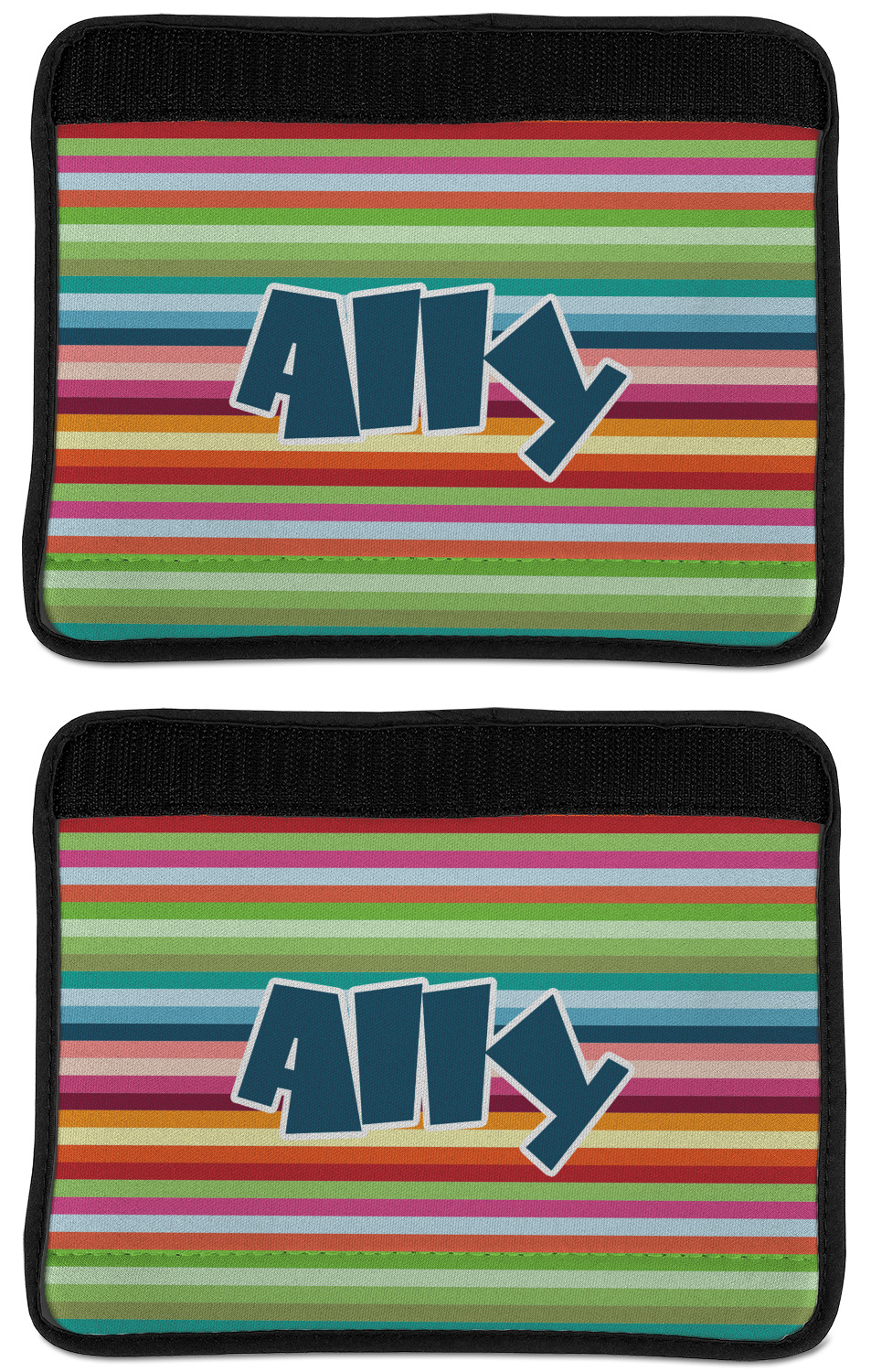 Made from neoprene, our seat belt strap covers wrap around the belt itself and have a Velcro tab for easy attachment and closure. The belt's edges are trimmed with a black polyester for a secure finish. Each cover is 9.5 by 7 inches when open and 9.5 by 2.5 inches when closed. We print your personalized design on the face of the seat belt pad.
