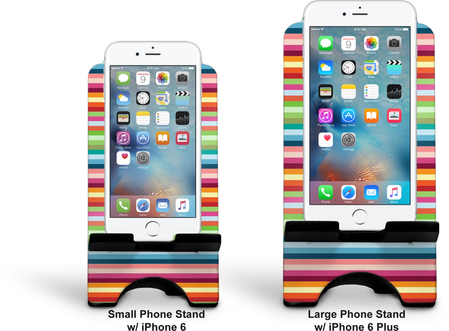 To meet your needs, we offer four variations of this IPhone stand. The backboard of the first version is shaped as a plain, yet sleek rectangle, and is available in two sizes. Our smaller size is approximately 4 by 3.25 by 7 inches, while the larger model is 4 by 3.77 by 8.5 inches. Alongside this model, we also provide you with a more decorative option. The upper part of our second version features a curved edge, for a classy, suave appearance. This phone holder is also sold in two sizes: a smaller version, which is 4 by 3.25 by 7 inches, and our larger model, which is 4 by 3.77 by 8.5 inches. Both models will support large phones, but the larger model is better if you wish to proudly display your personalized design.