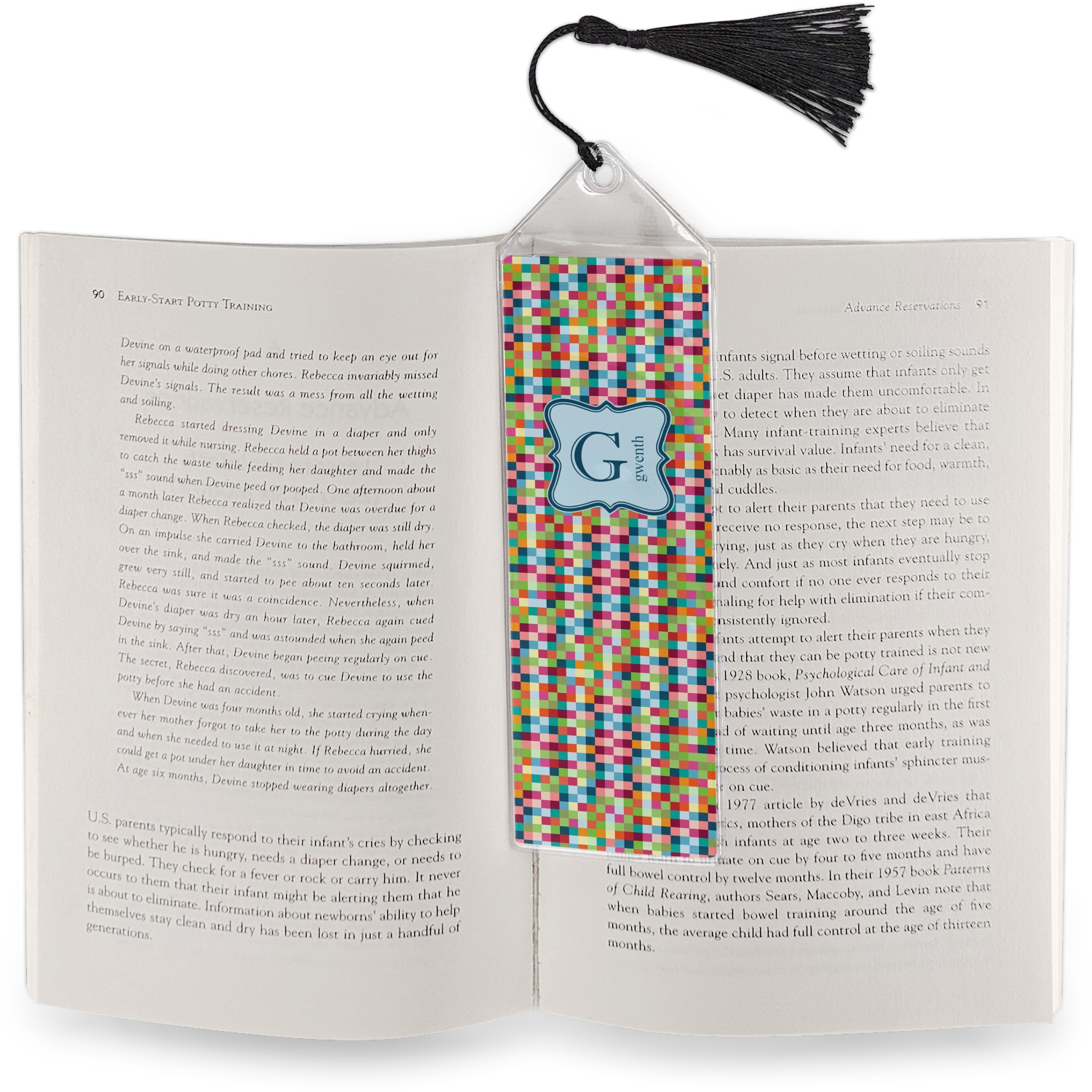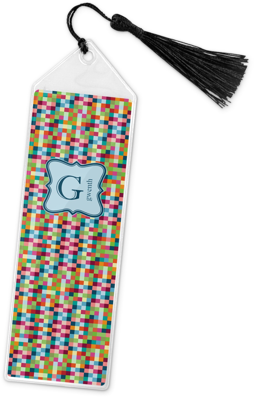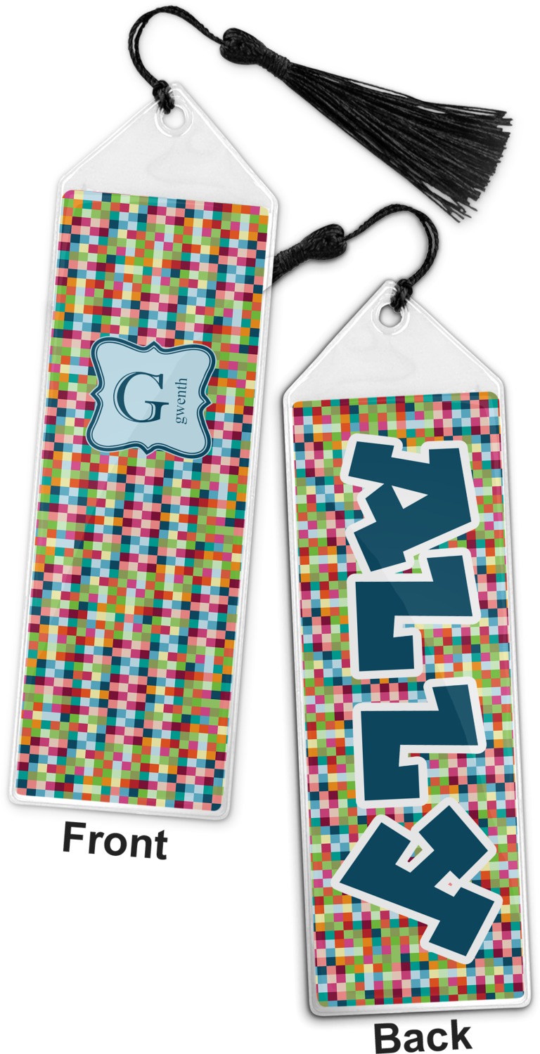 Your personalized bookmark is made of a sturdy, clear vinyl, and is approximately 7.5" x 2.25". We display your personalization on vinyl inserts that are placed on both sides. Accompanying each book marker is a black, fringe tassel that attaches to the reinforced, triangular header.