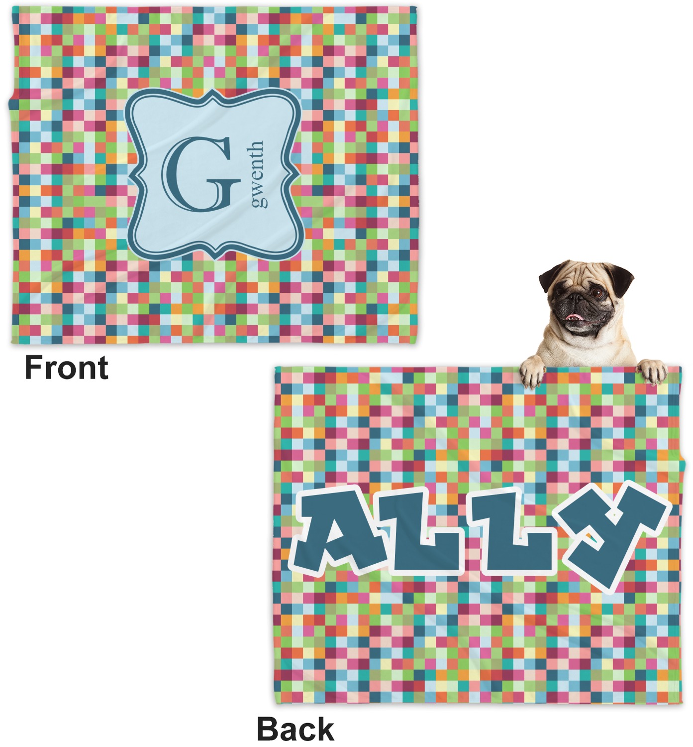 These dog blankets are crafted from a gentle, soft-to-the-touch, minky material. We print your customizations, either matching or differing, on both the top and underside of the blanket. These personalized dog blankets are available in two sizes: regular and large. Our regular size, at 40" x 30", accommodates small and some medium size dogs. At 60" x 50", our large dog blanket is a better fit for bigger breeds. Though specialized for dogs, these blankets still make a thoughtful gift for your favorite feline, or any other pet in mind!