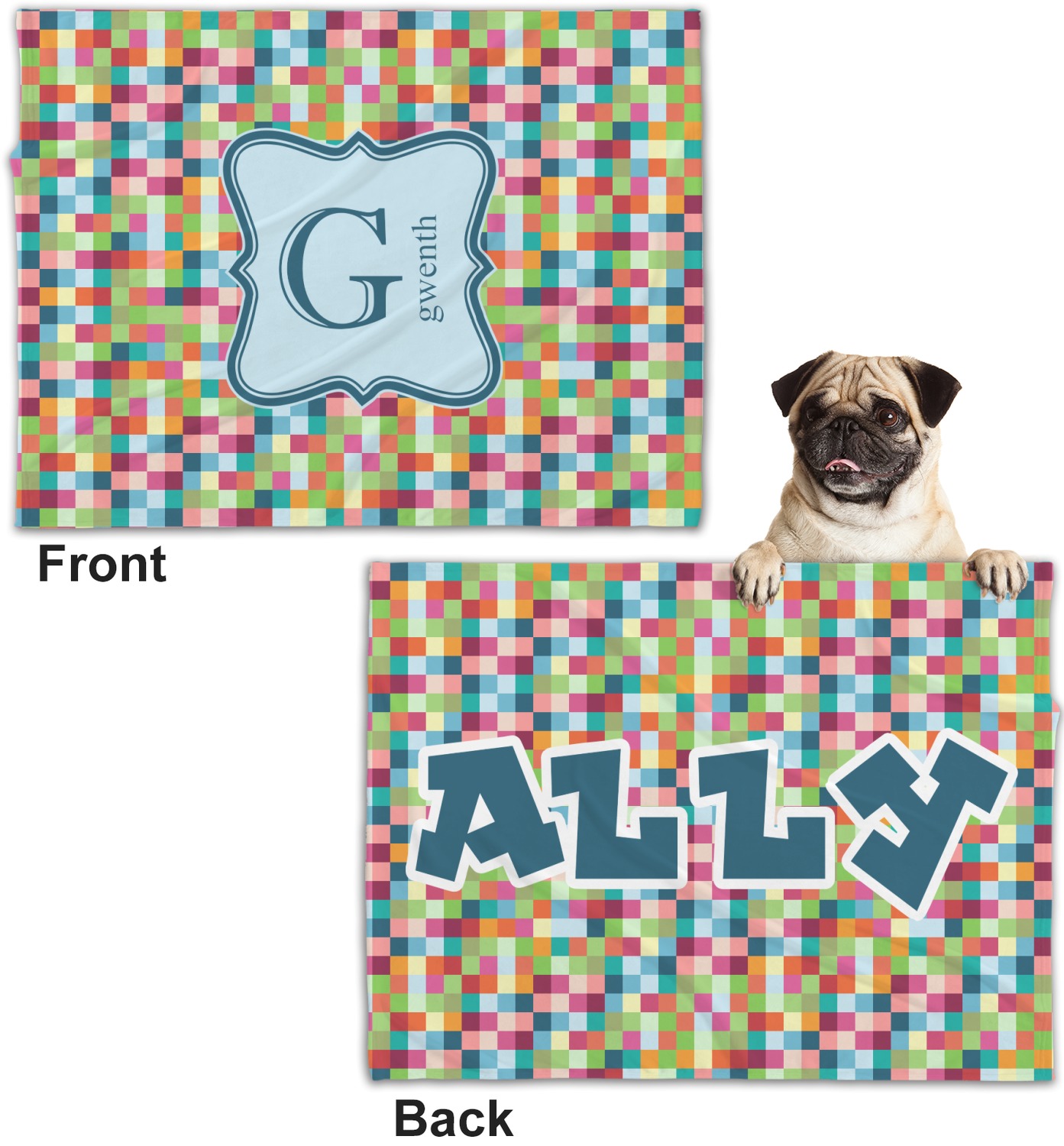 These dog blankets are crafted from a gentle, soft-to-the-touch, minky material. We print your customizations, either matching or differing, on both the top and underside of the blanket. These personalized dog blankets are available in two sizes: regular and large. Our regular size, at 40" x 30", accommodates small and some medium size dogs. At 60" x 50", our large dog blanket is a better fit for bigger breeds. Though specialized for dogs, these blankets still make a thoughtful gift for your favorite feline, or any other pet in mind!