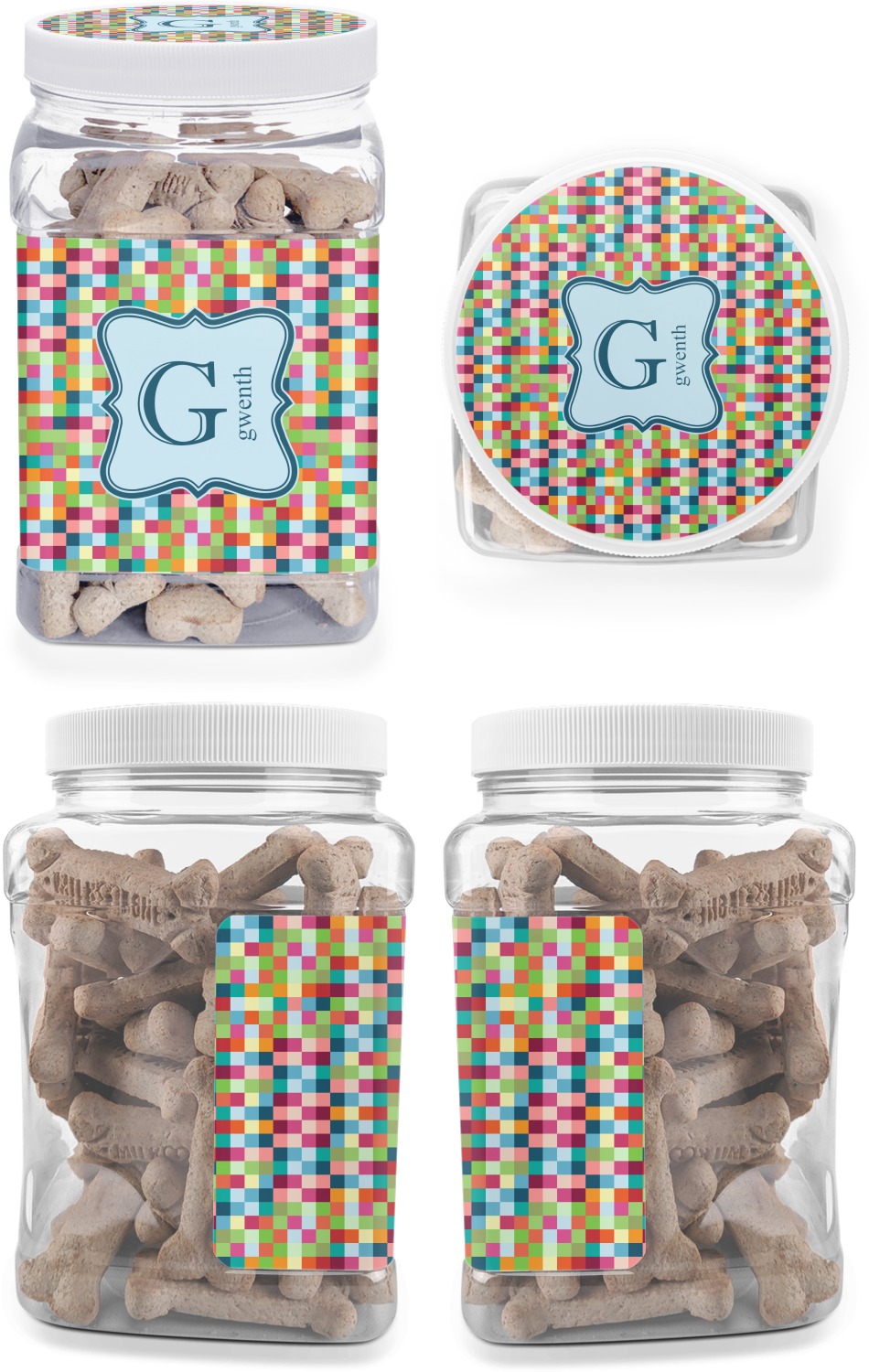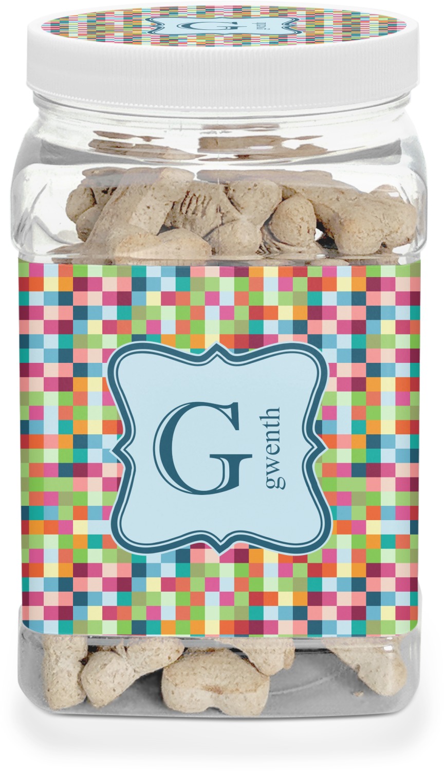 This half gallon jar, made from a sturdy plastic, is the perfect way to keep treats from any naughty pet paws, while still keeping them ready on hand for when your pup performs an impressive trick. This dog cookie jar features a screw-on, white lid that displays your personalized design on a vinyl sticker. We apply another customized sticker that wraps around the front and sides of the jar. Our dog treat jar also has indentations on the rear ends of the sides, which allows for convenient handling, and its square frame allows for easy storage.
