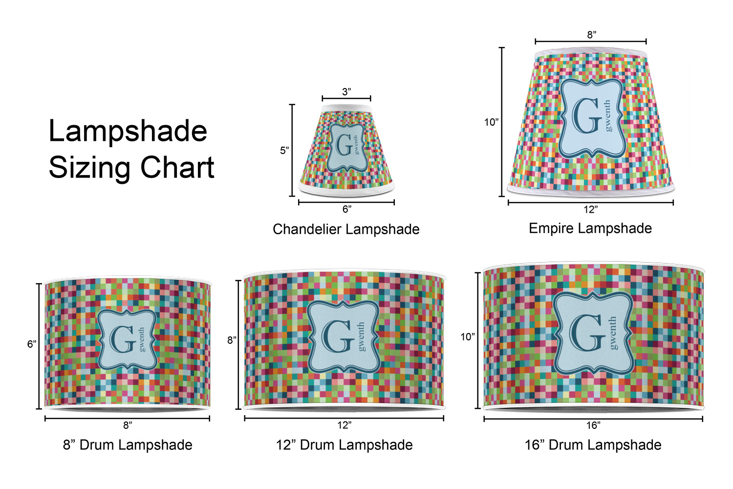 Our customized lamp shades also come in 3 different sizes: 8", 12" and 16", measuring at 8" in diameter by 6" tall, 12" in diameter by 8" tall, and 16" in diameter by 10" tall, respectively.