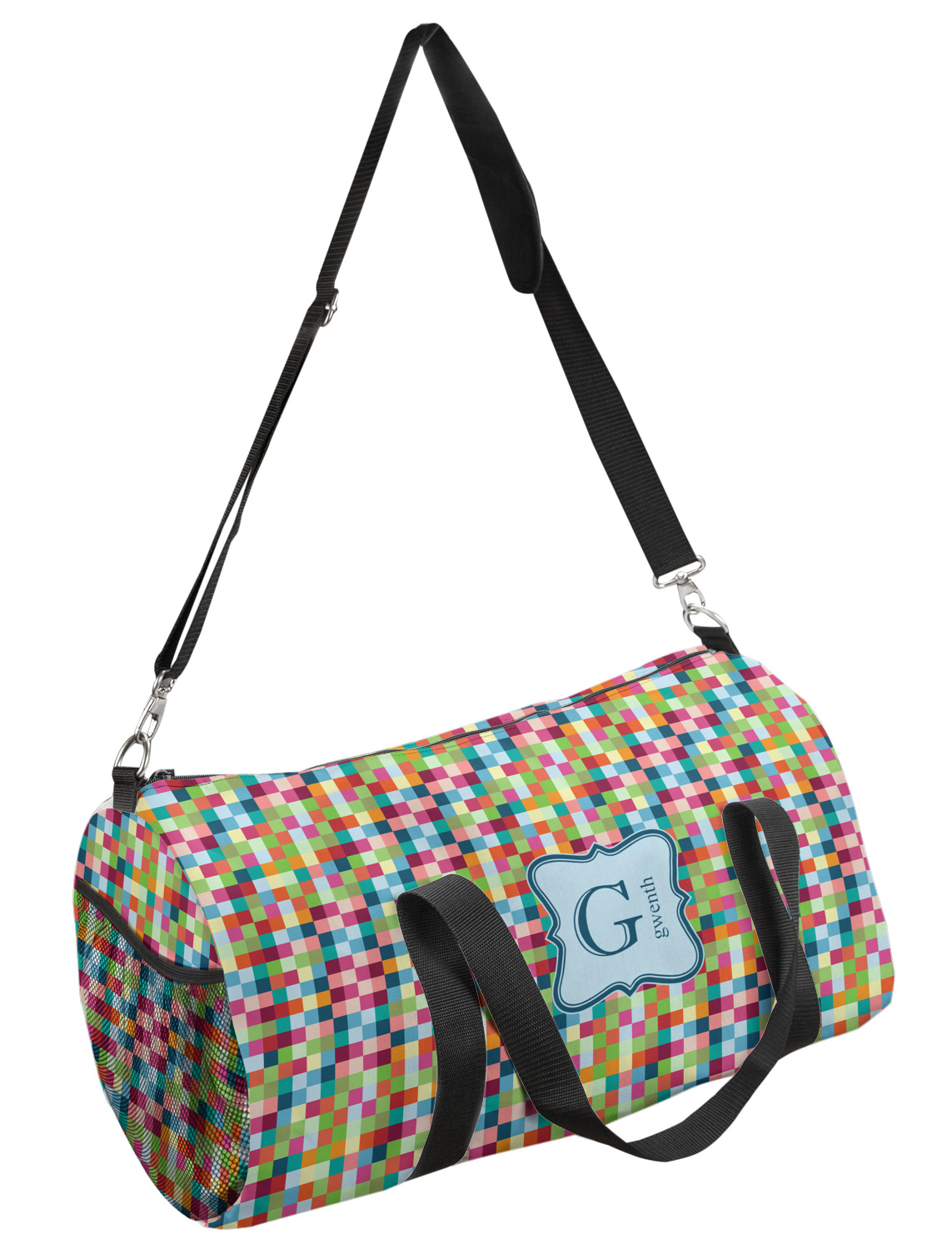 This duffle is a sturdy bag made of a canvas material. It comes in two sizes: Small (19"W x 9.5"H x 9.5"D) and Large (23"W x 12"H x 12"D). The bag is a cylindrical shape with a black adjustable strap and two handles. On one side is an elastic pouch to put a waterbottle or other small item. Your product will be sublimated with your design and is able to be designed on the front, back, and sides. Be sure to remember that the straps may cut into parts of your design if you upload your own artwork.