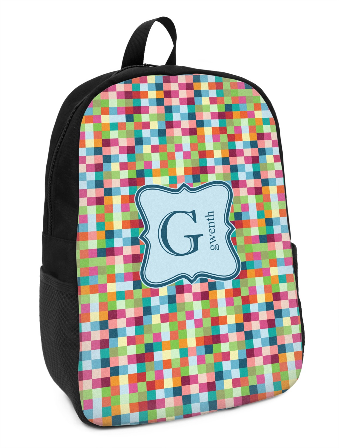 These small backpacks are made of a durable black canvas material with your personalization right on the front. The two shoulder straps are padded and easily adjustable. The bag itself measures at about 11" W x 15" H x 5" D. It's the perfect size for elementary aged kids or adults who want a smaller backpack. On the top of the bag you will find a handle to hang or carry your backpack by as well as a large zipper closure to keep all of your belongings safe inside. On each side of your backpack is a mesh pocket for a small item or water bottle. Inside your backpack you will find a spacious area with a small zipper pocket and a padded laptop slot that will fit up to a 13" laptop (13" being very snug). This is the perfect bag for any student that needs a couple books and their laptop with them at all times. It also works great as a carry on for traveling!