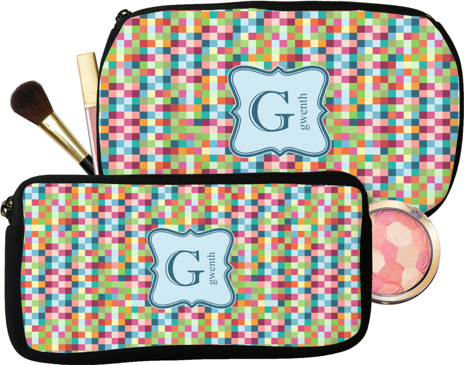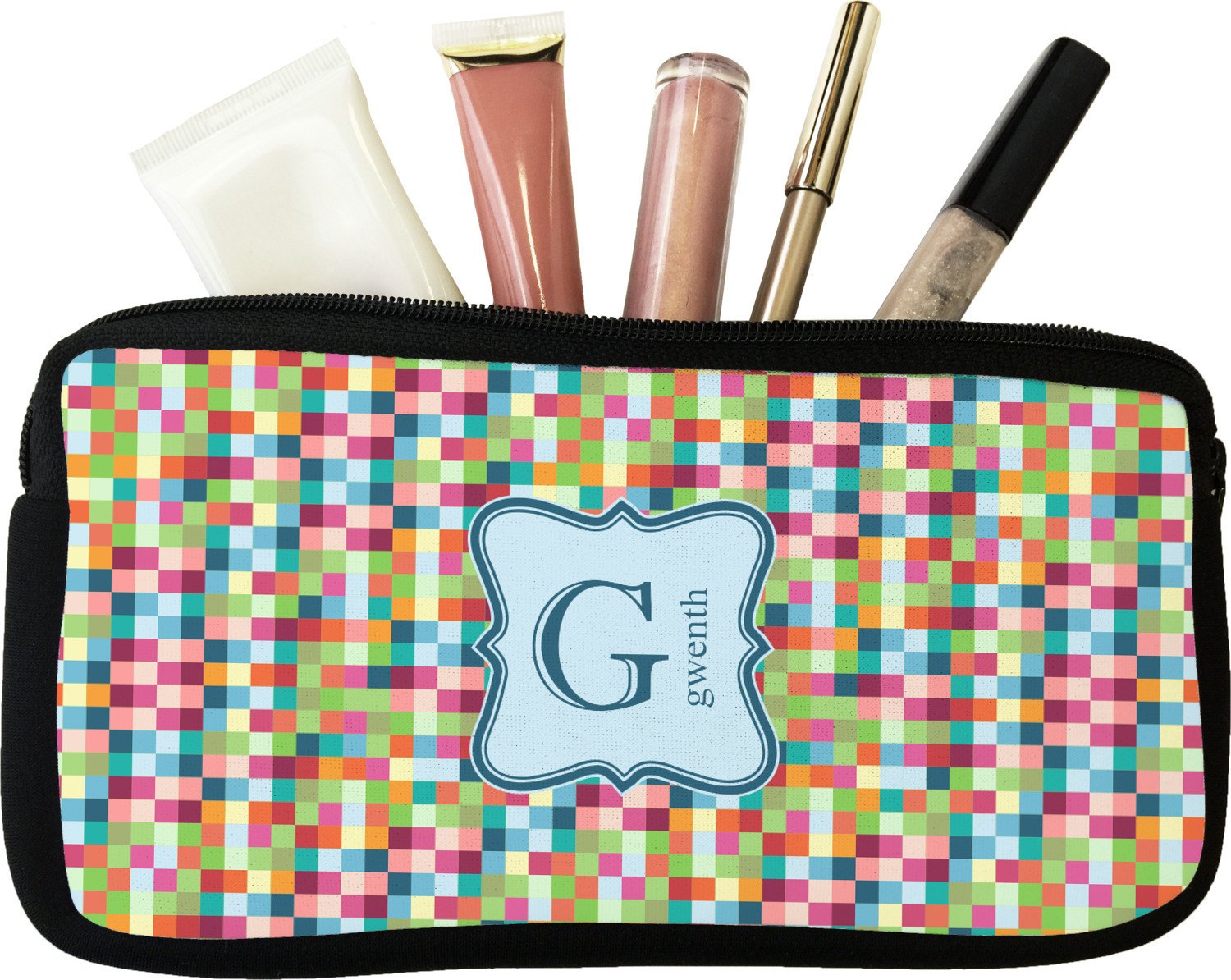 Our personalized makeup bags are available in many different designs, patterns and colors - so you are sure to find one that will love. They are made of neoprene (same material as wet-suits) and thus are water resistant, so spillages in your makeup bag will not end up all over you purse. They are customized on one side and are black on the other side and the zipper is black as well.