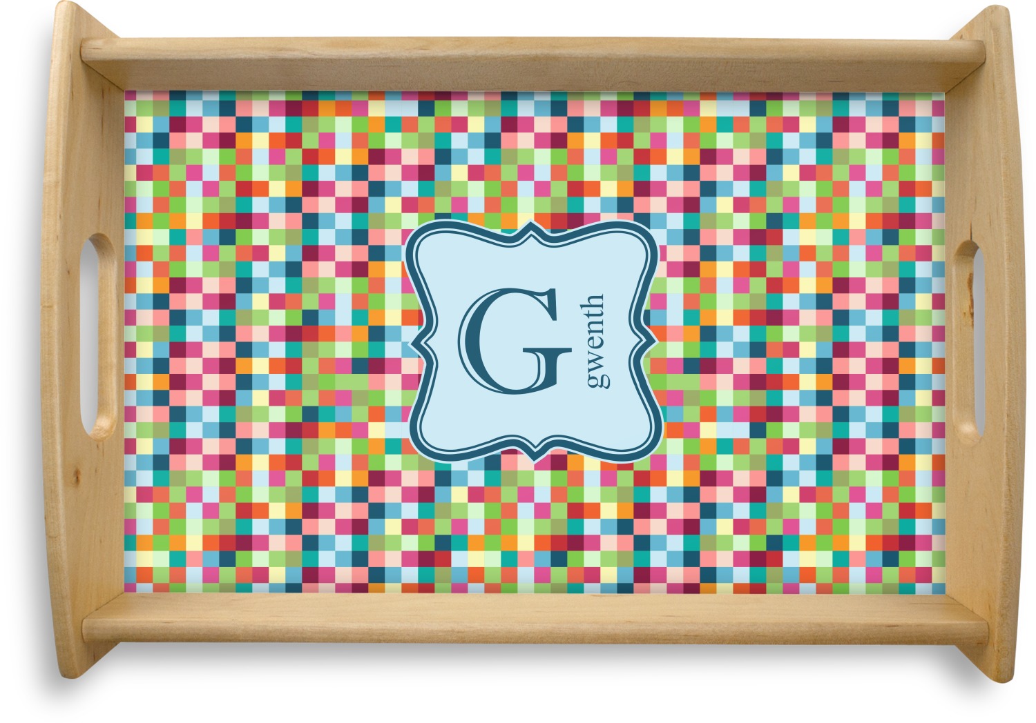 This serving tray with handles features square edges and two rounded sides, creating a very modern look. Each side is fabricated from a beautifully cut, natural wood. The bottom of the interior of the tray displays your customized design in bright, vibrant color. The tray is sold in both a black color and a natural wood look. Each variation of the wood serving tray has two sizes: Small, which is 14" x 10" x 2.25", and Large, which is 19.5" x 13.5" x 2.75".