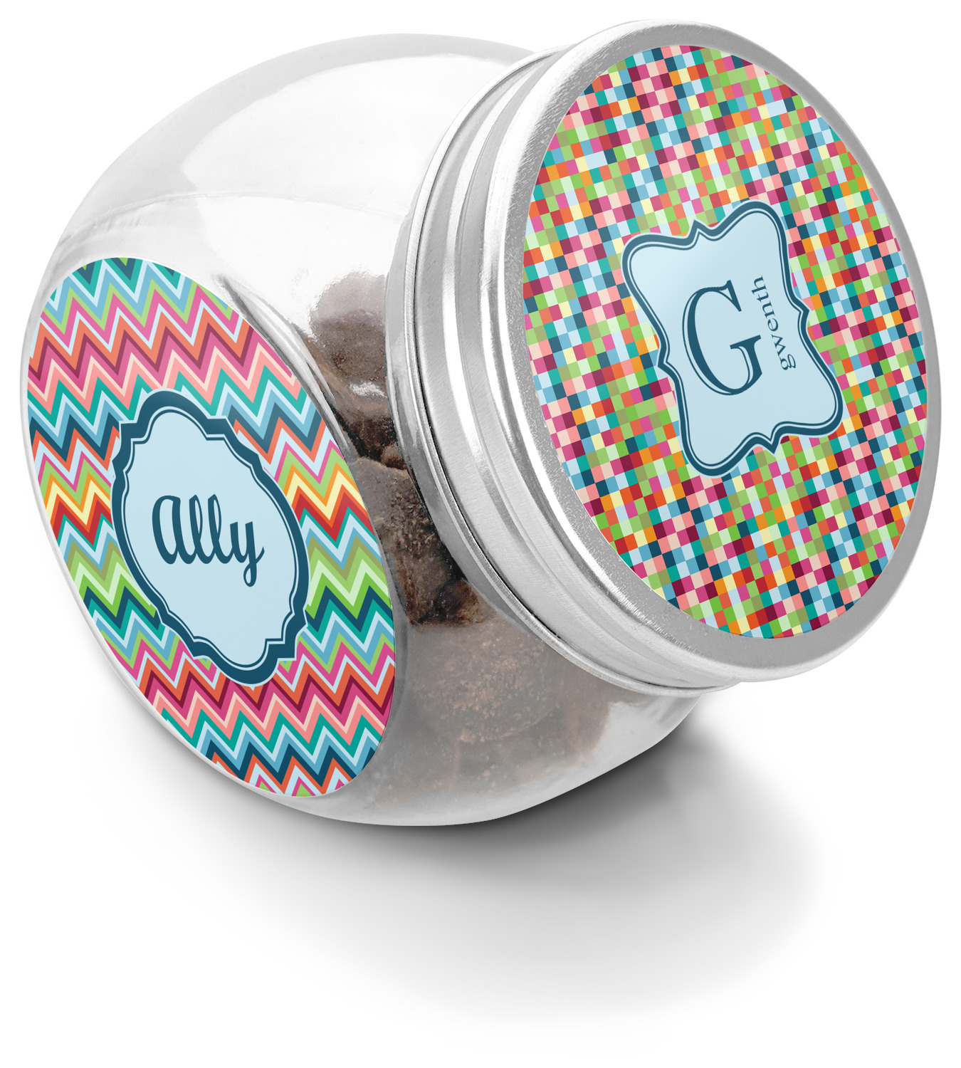 This treat jar is an excellent way to store treats for your favorite canine or feline. Moreover, their delicate, classy appearance makes them a tasteful addition to your countertop's décor. Crafted from clear glass, its unique construction and silver metal, screw-on lid allows for quick and easy access. Three, permanent, vinyl stickers are applied to both sides of the jar and lid, presenting your personalized design. The base of this glass, dog treat jar is 3.4" x 4.75", and the jar stands at 5" tall. Though on the smaller side, this jar is best suited for smaller treats or training treats.